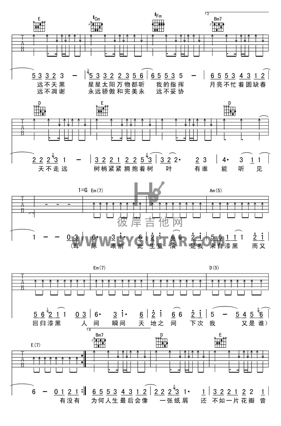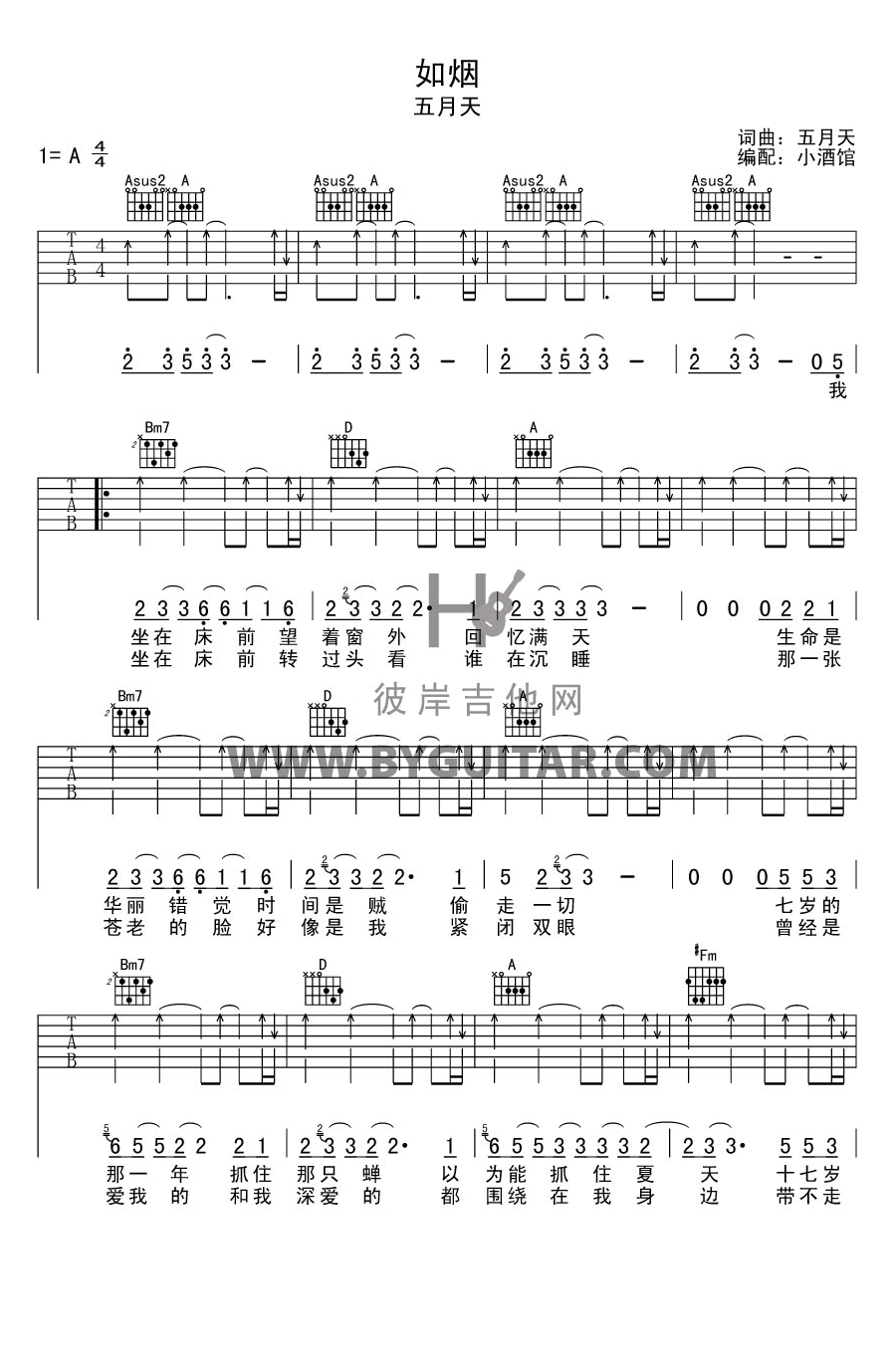 如烟吉他谱C调-五月天《如烟》完整原版六线谱