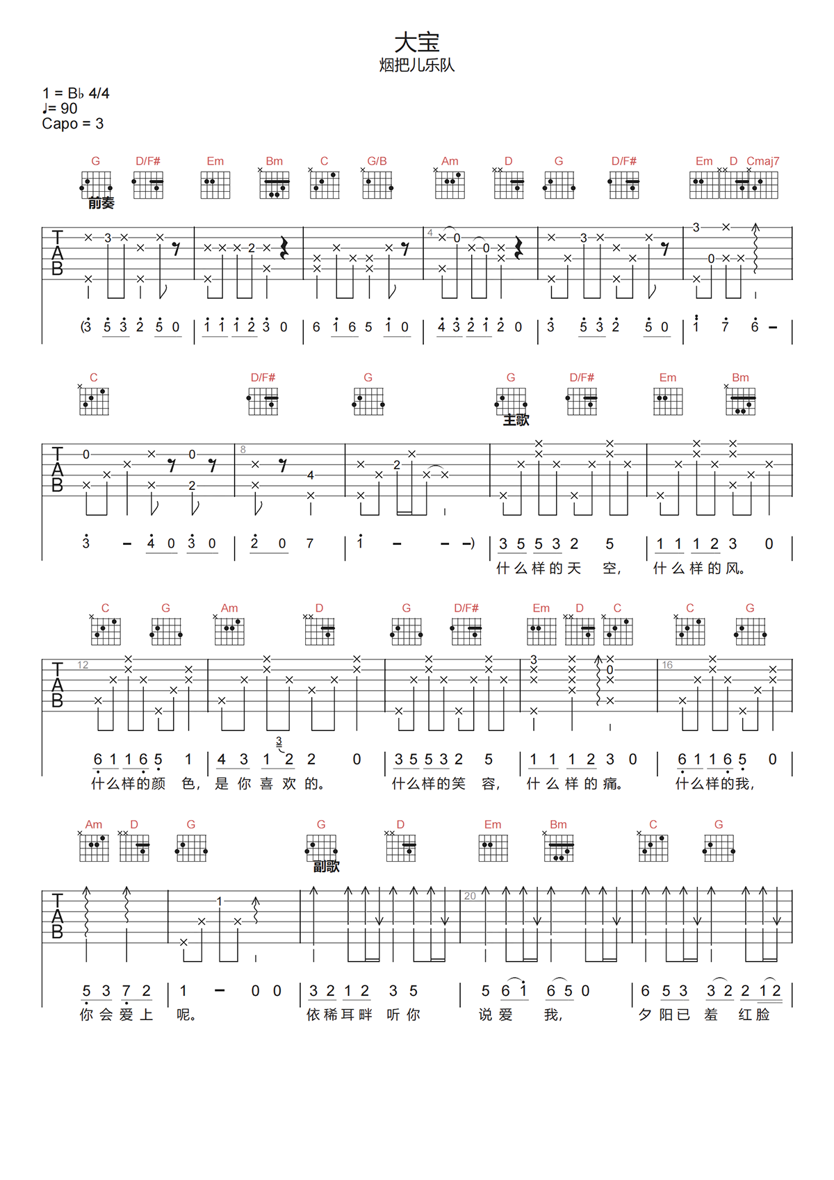 大宝吉他谱-烟把儿乐队《大宝》G调图片谱-原版六线谱