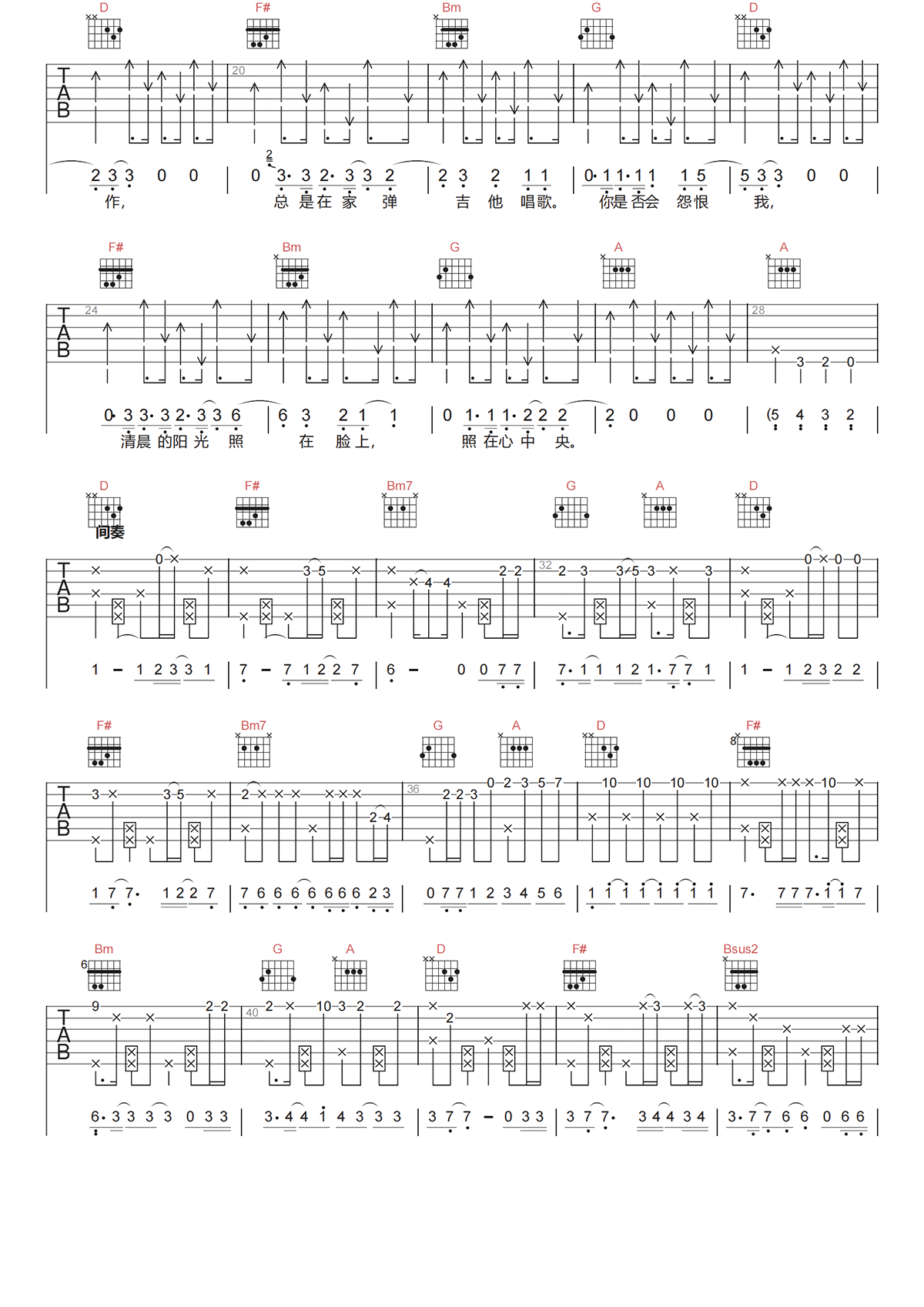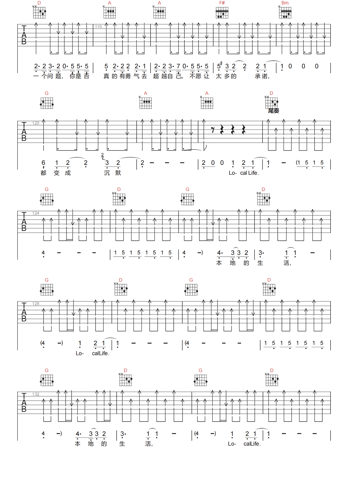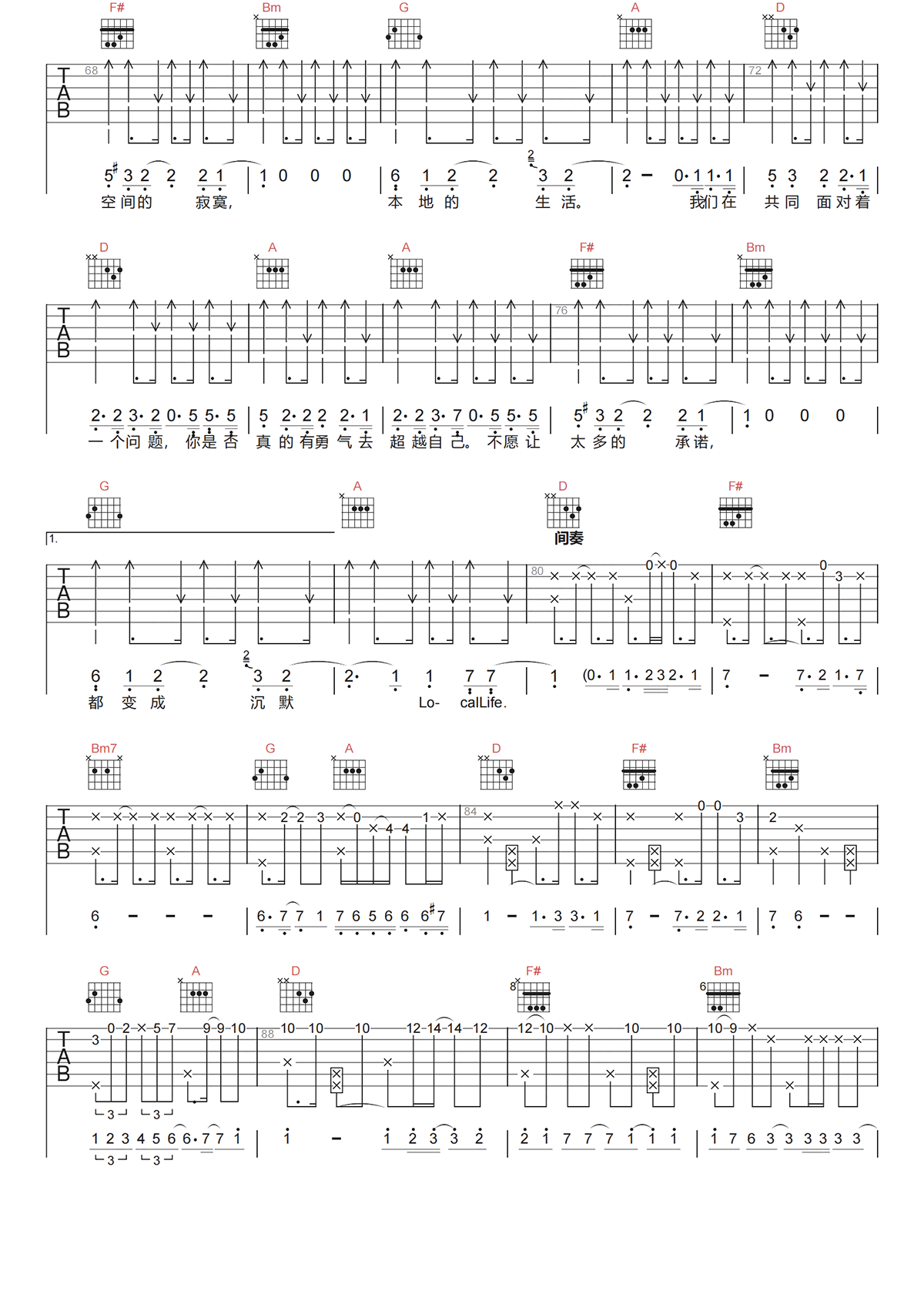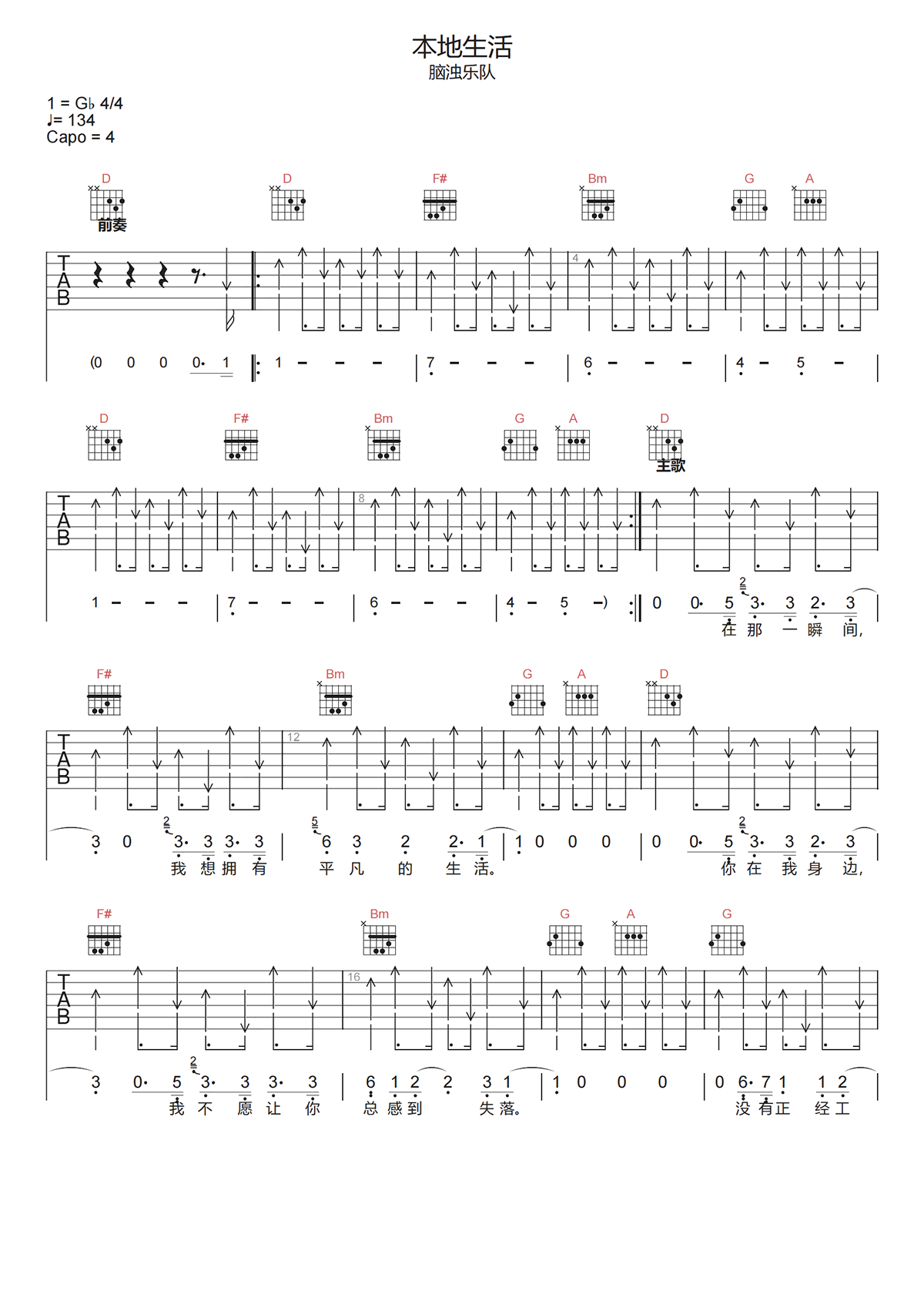 脑浊乐队《本地生活吉他谱》D调原版六线谱