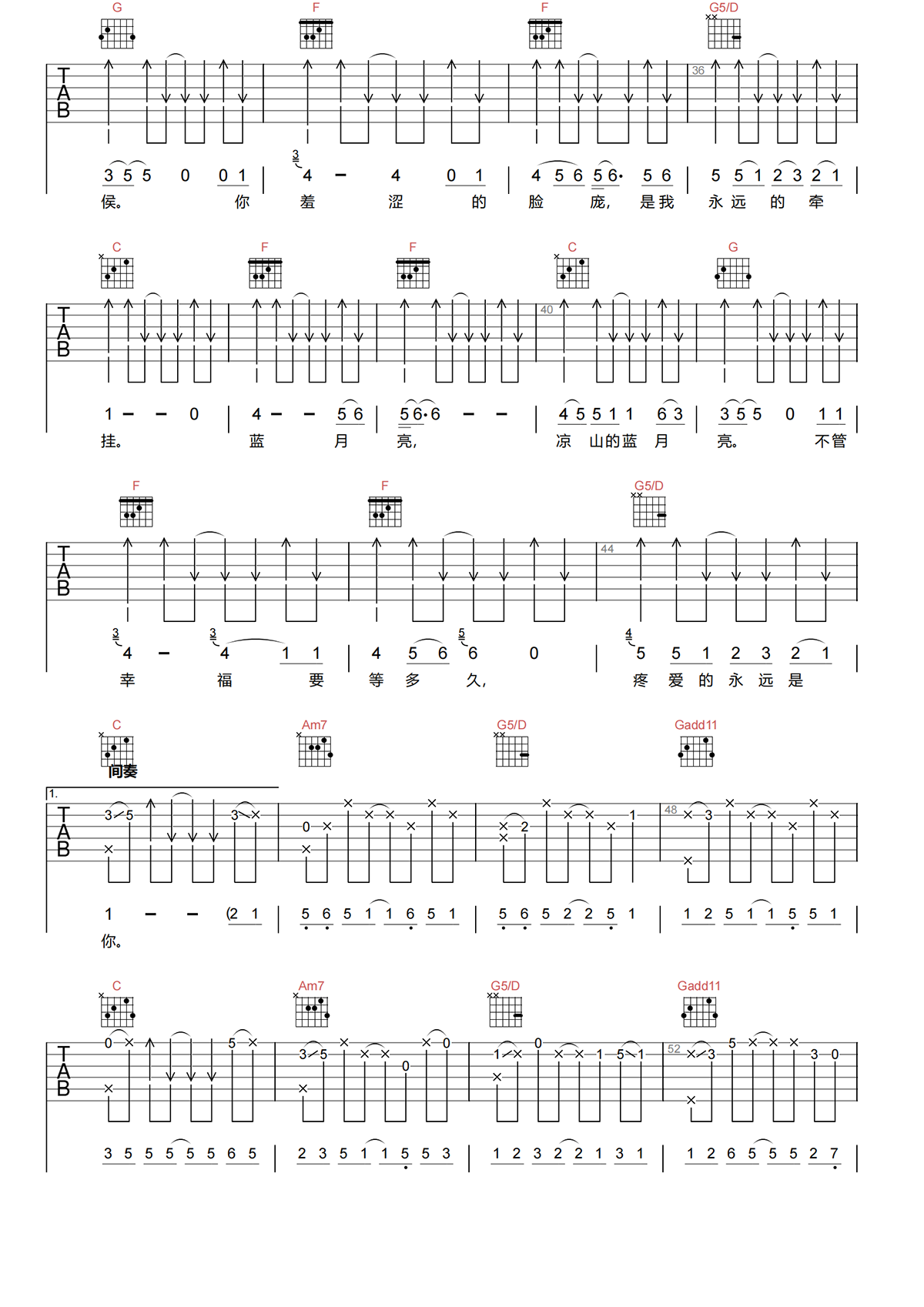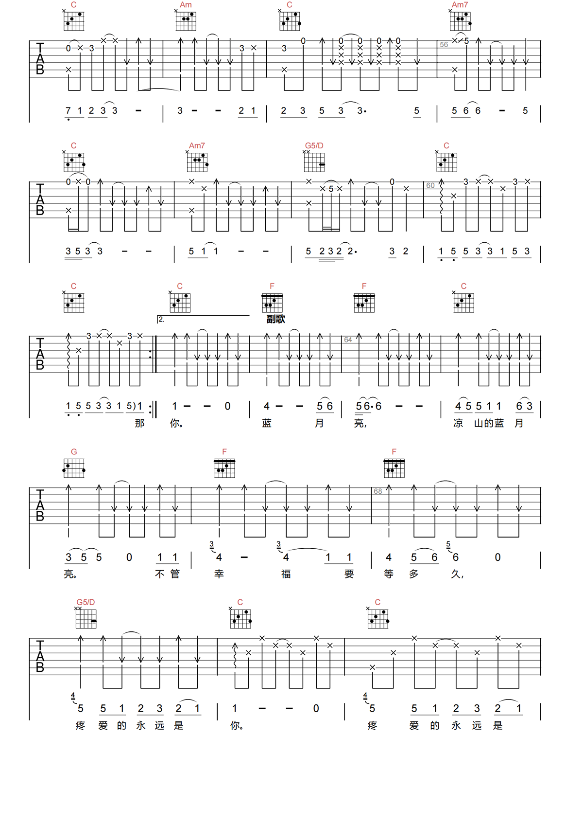 蓝月亮吉他谱C调-雷婷《蓝月亮》完整原版六线谱