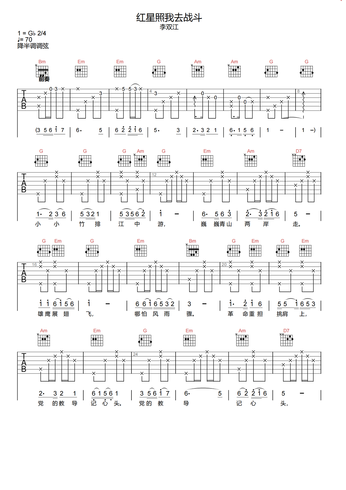 李双江《红星照我去战斗吉他谱》G调原版六线谱