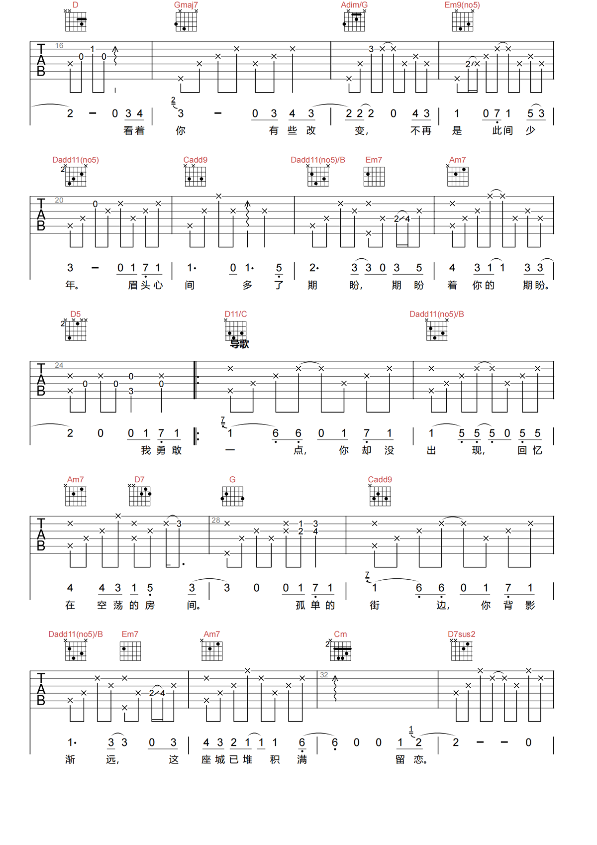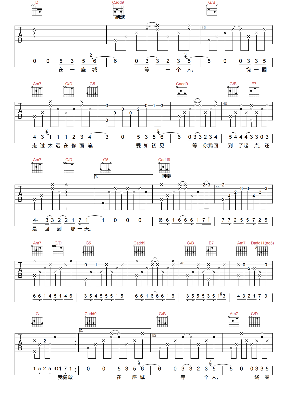 隔壁老樊《在一座城等一个人吉他谱》G调原版六线谱