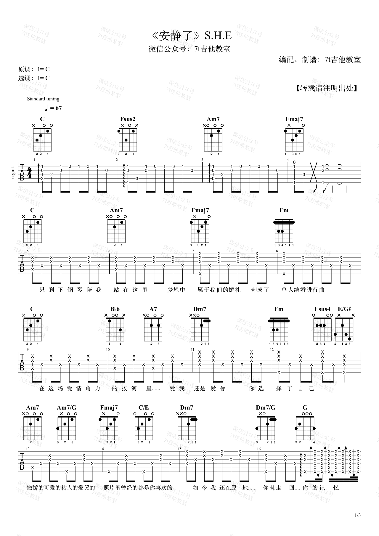 安静了吉他谱C调-SHE《安静了》完整原版六线谱