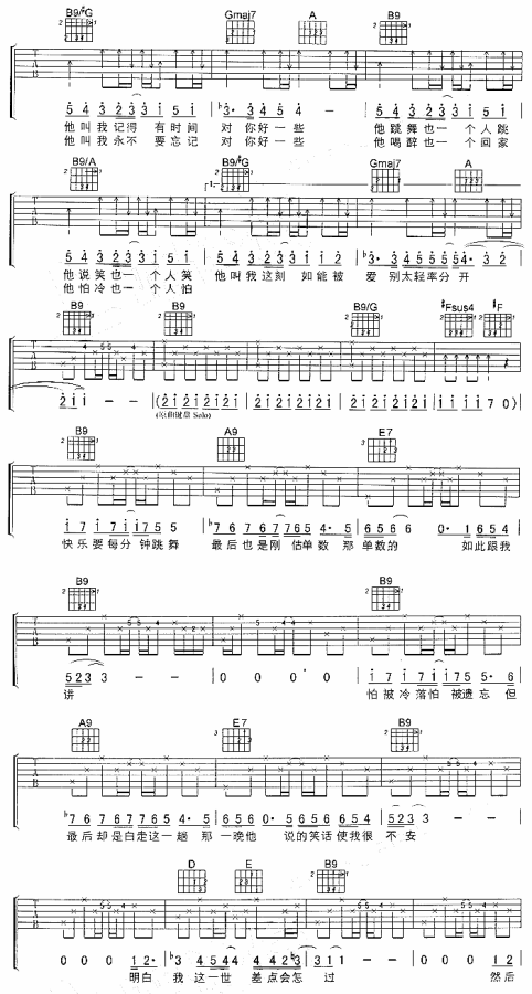 陈奕迅《他一个人吉他谱》B调原版六线谱