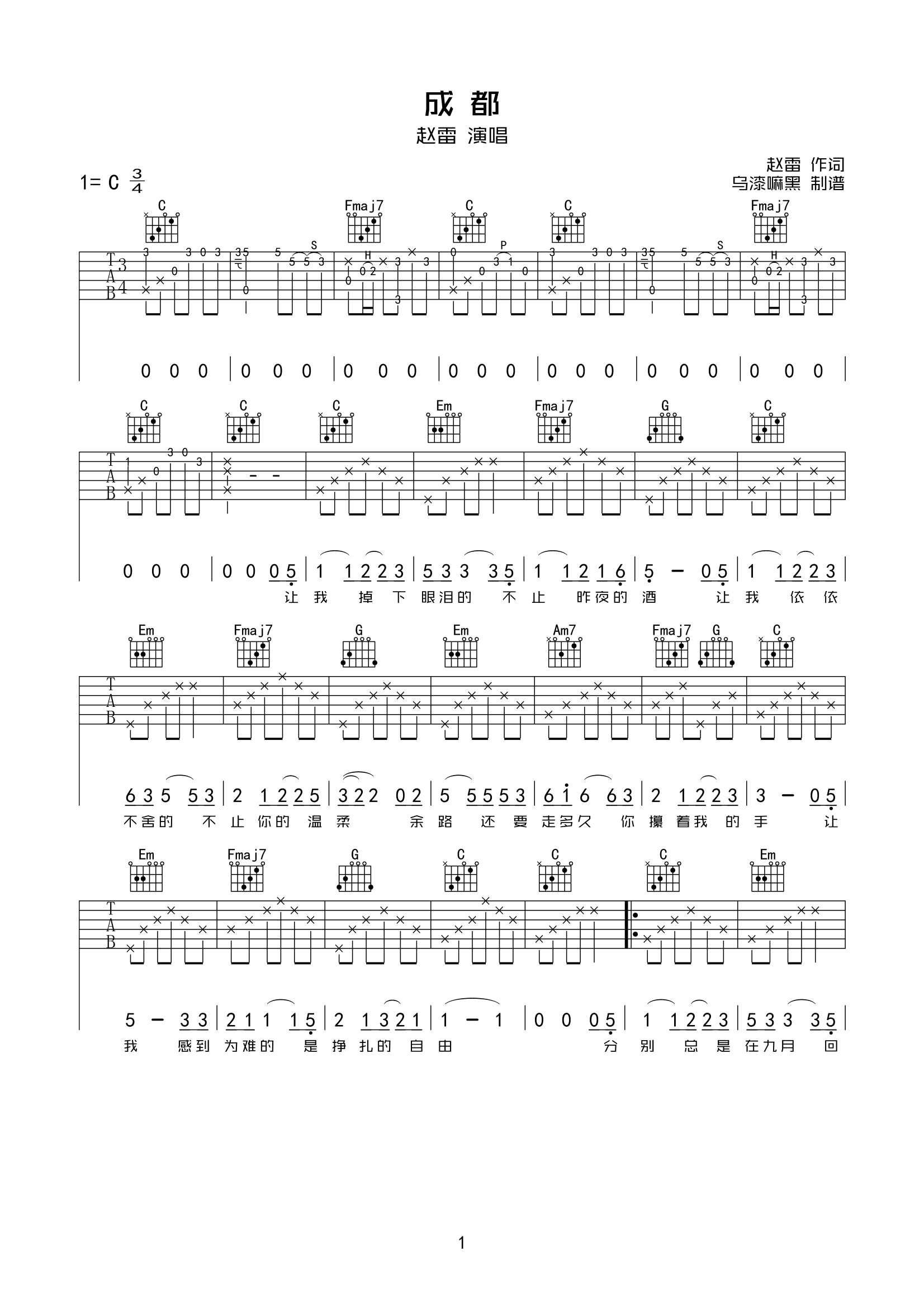 成都吉他谱C调-赵雷《成都》完整原版六线谱-精简编配