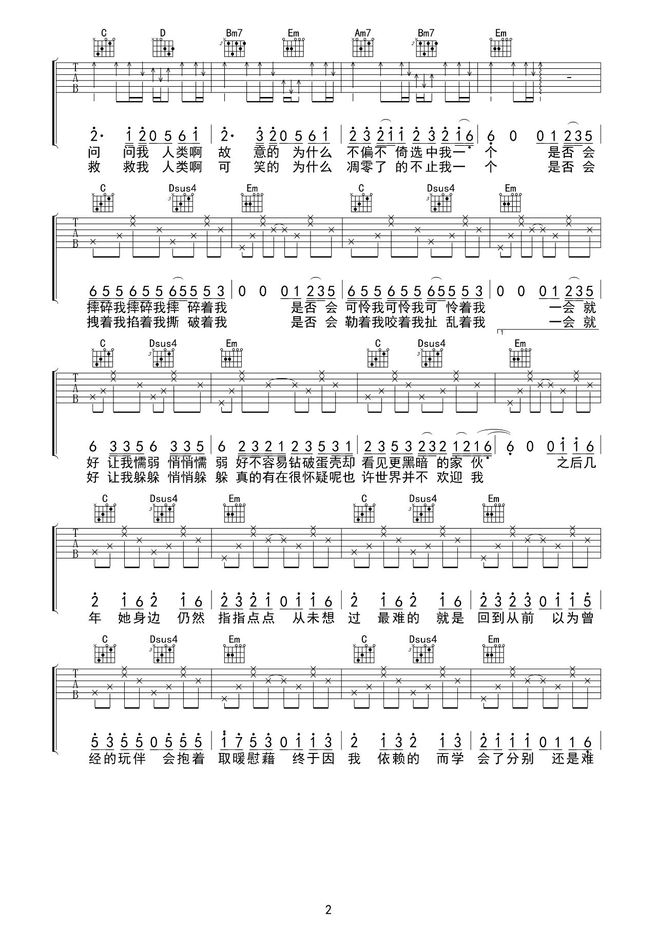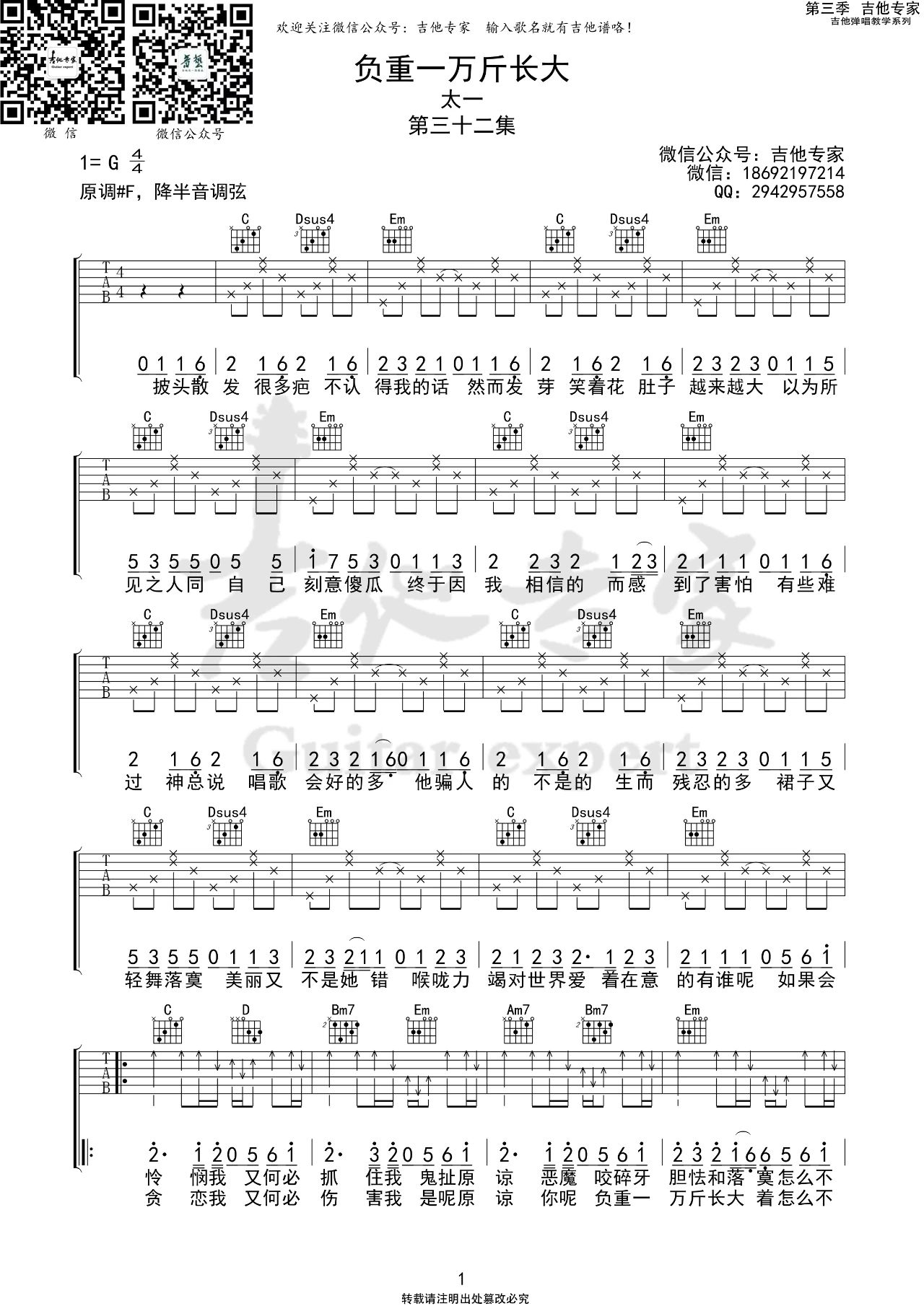 太一《负重一万斤长大吉他谱》G调原版弹唱谱