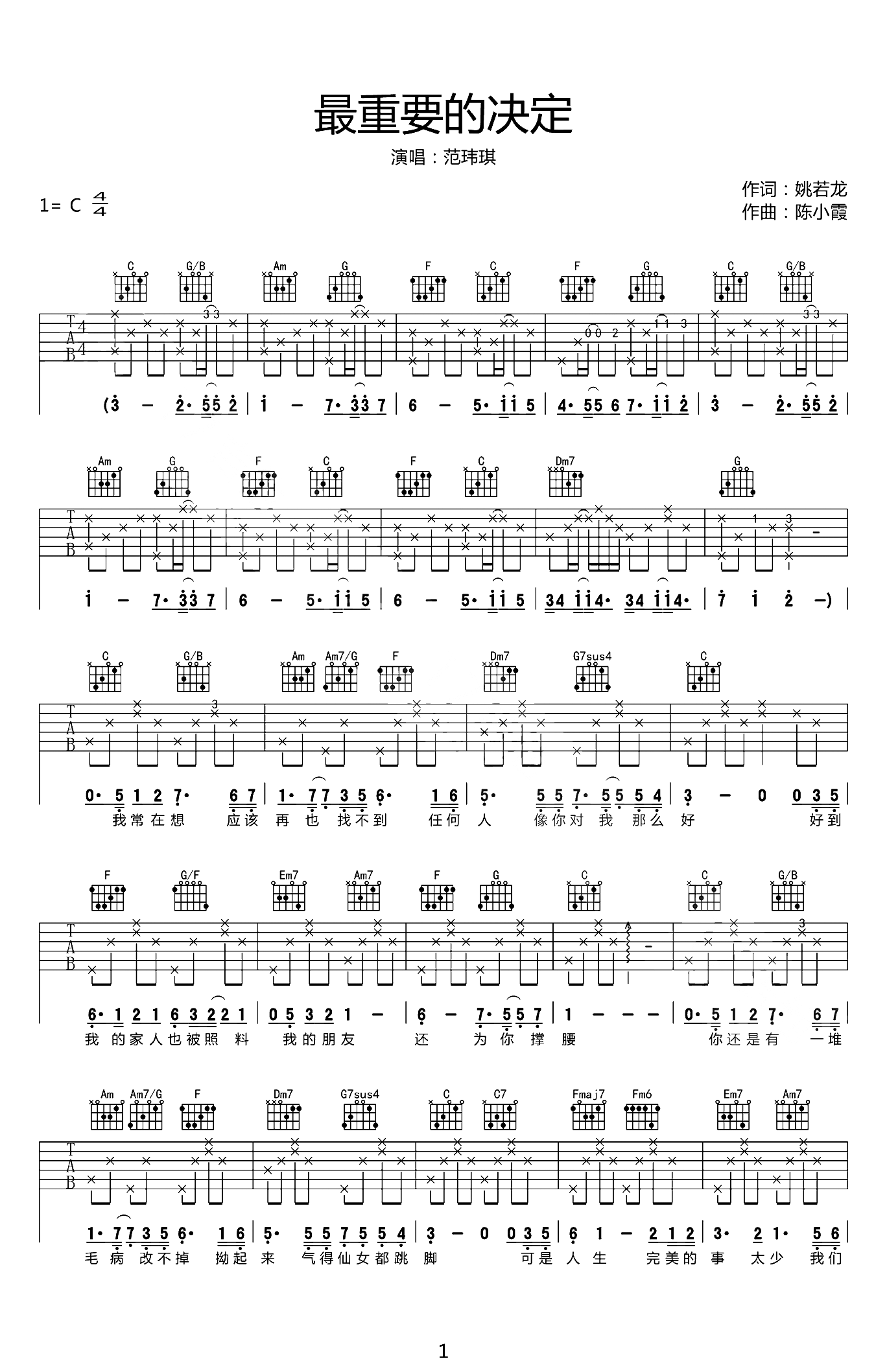 范玮琪《最重要的决定吉他谱》C调原版弹唱谱