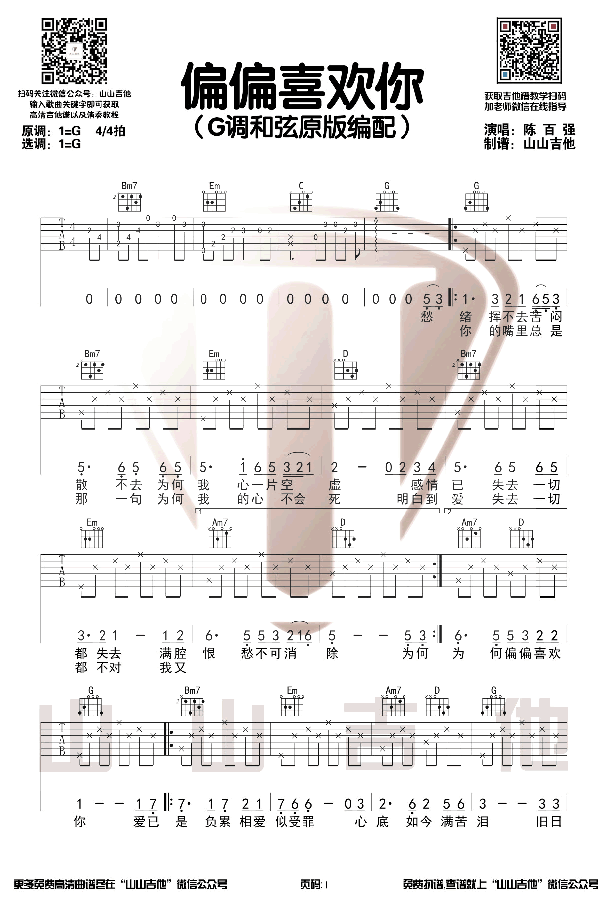 偏偏喜欢你吉他谱G调-陈百强-弹唱六线谱-完整原版