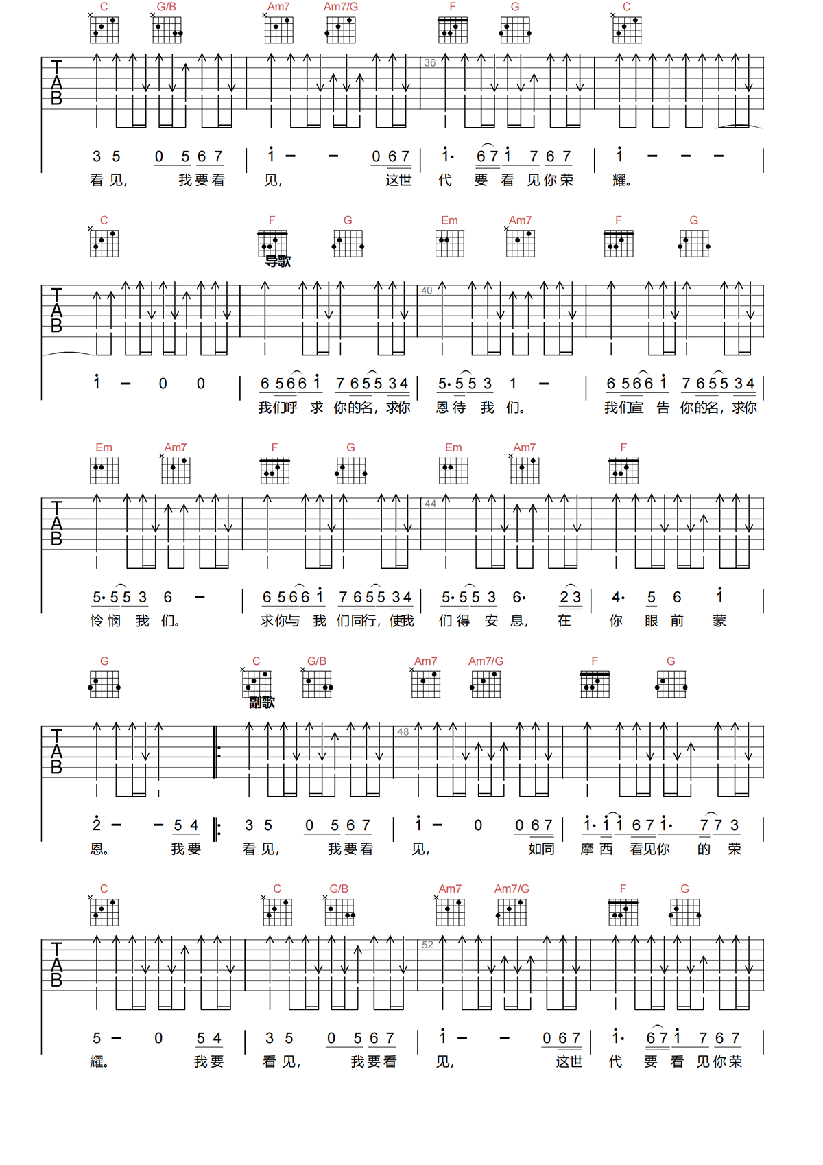 我要看见吉他谱-赞美之诗-C调原版六线谱-高清弹唱谱