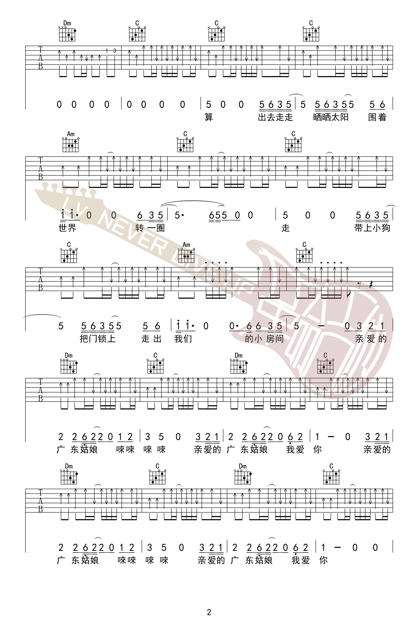 广东姑娘吉他谱C调-五条人-完整原版六线谱
