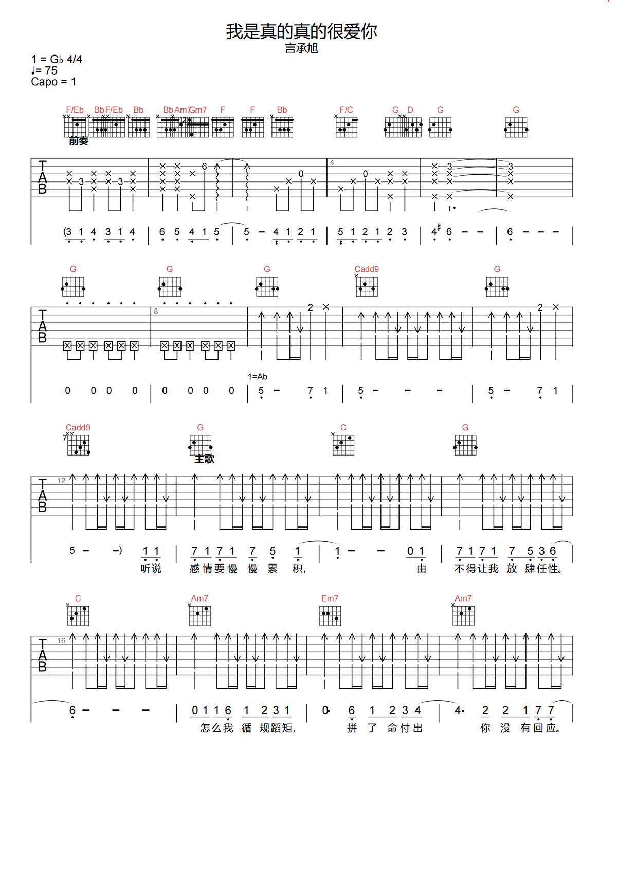 言承旭《我是真的真的很爱你吉他谱》G调原版六线谱