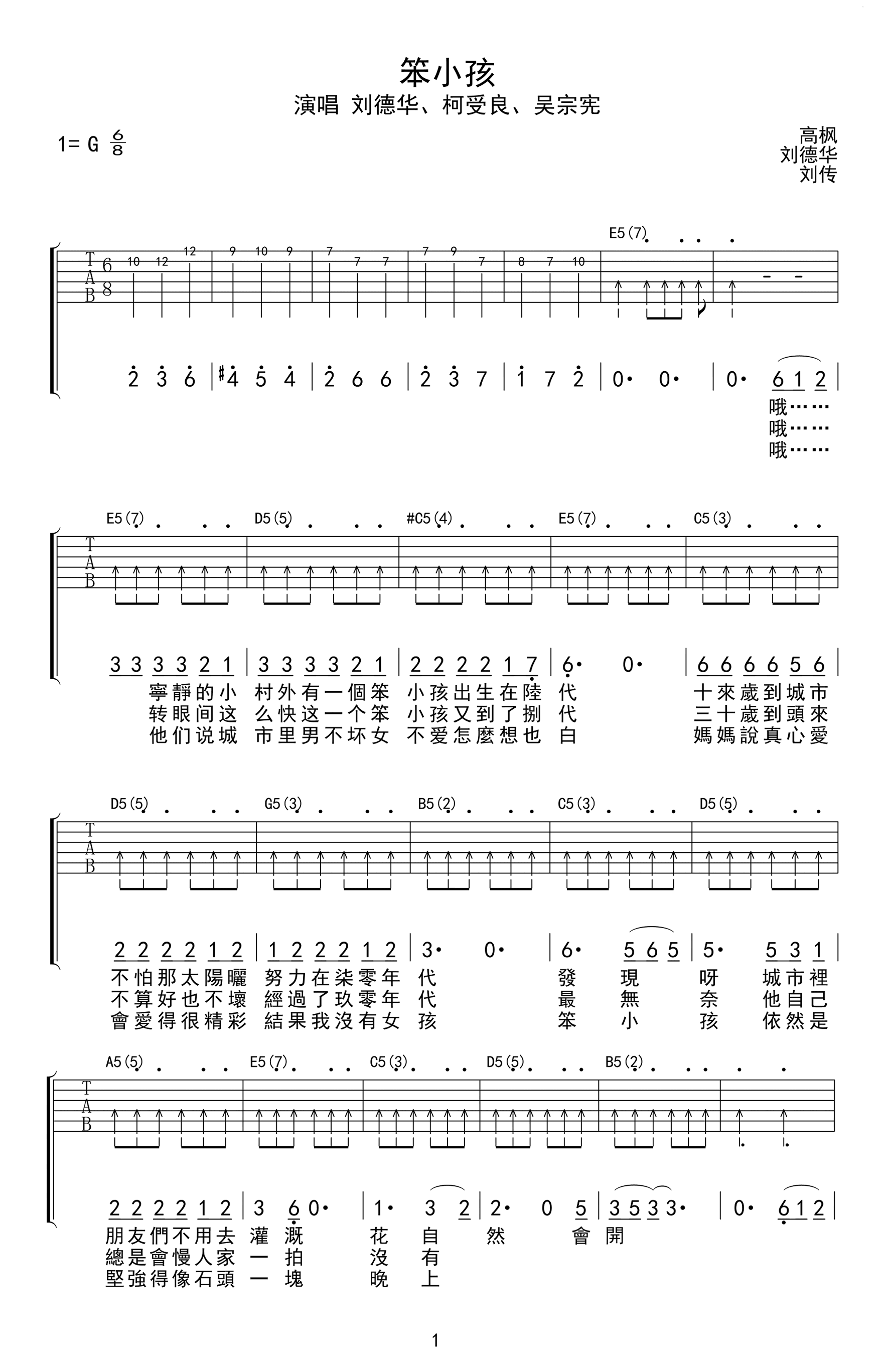 笨小孩吉他谱C调-刘德华/柯受良/吴宗宪《笨小孩》完整原版六线谱