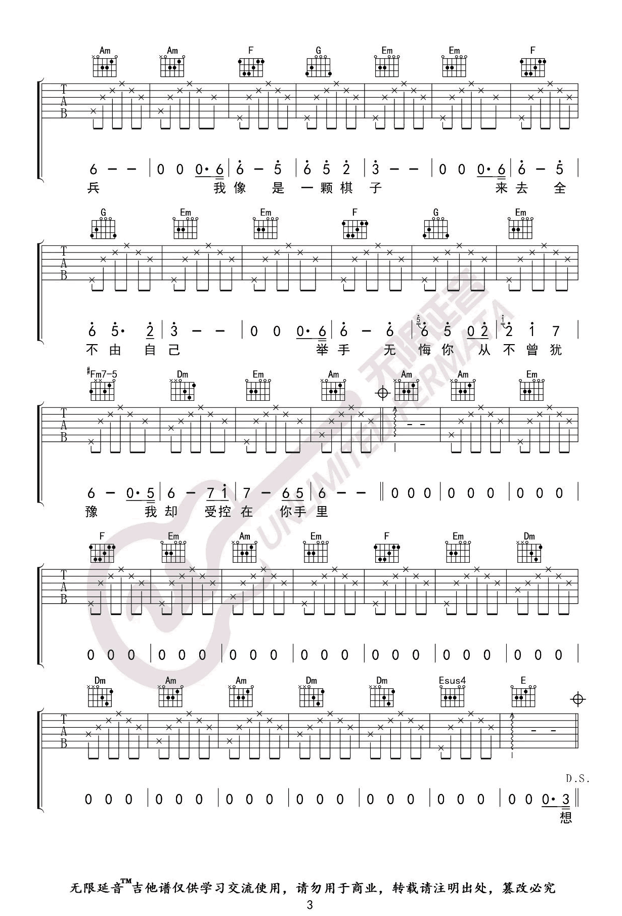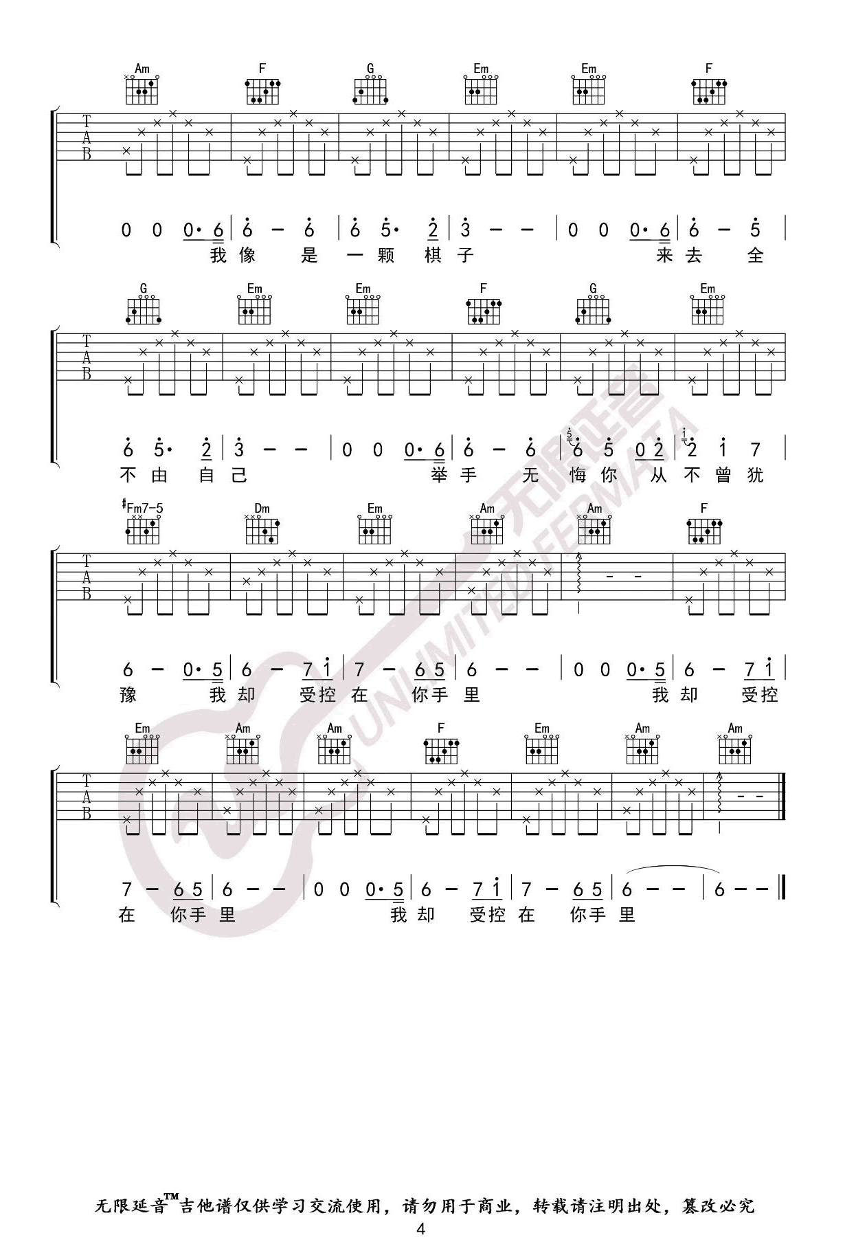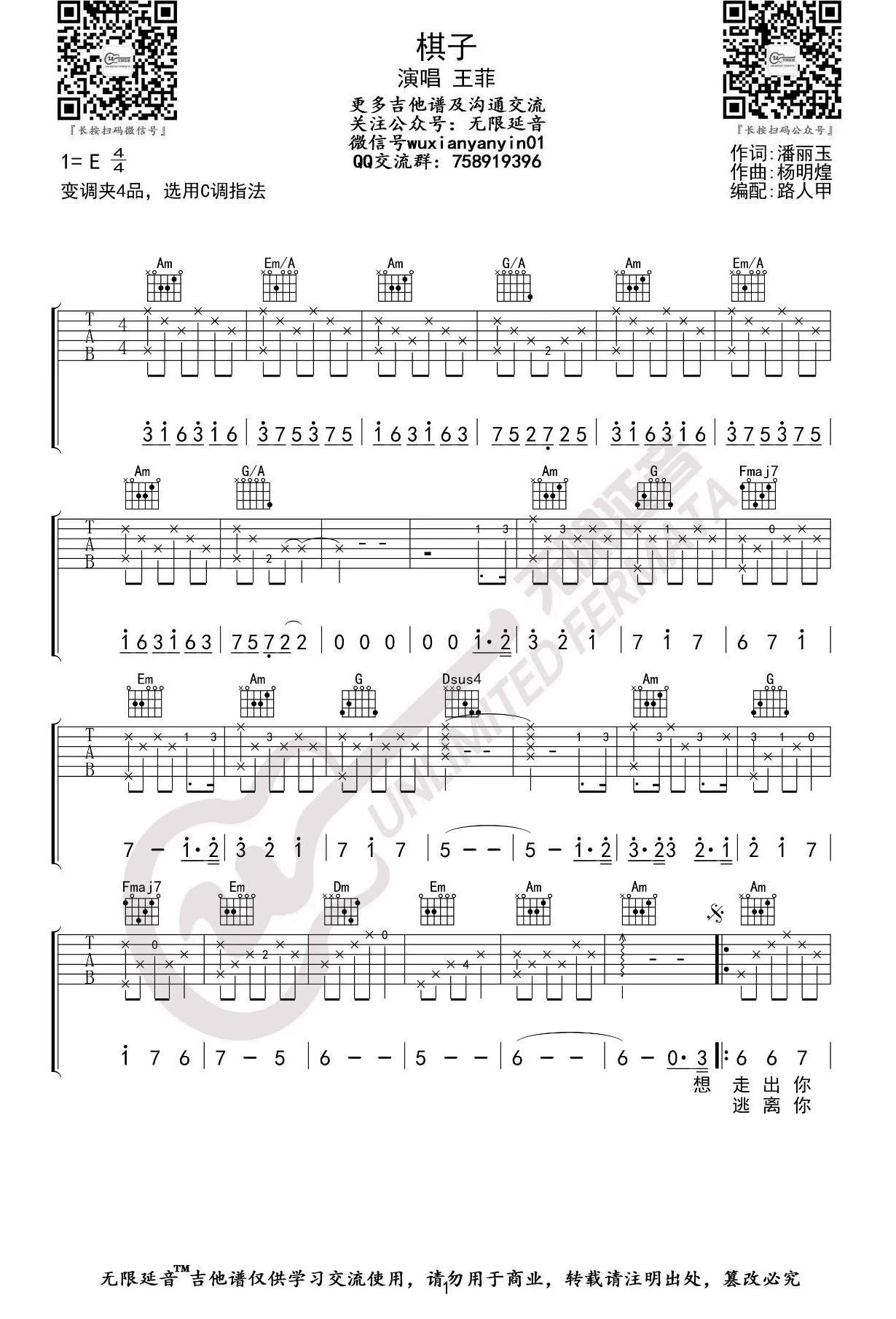 棋子吉他谱-王菲《棋子》C调图片谱-原版弹唱谱