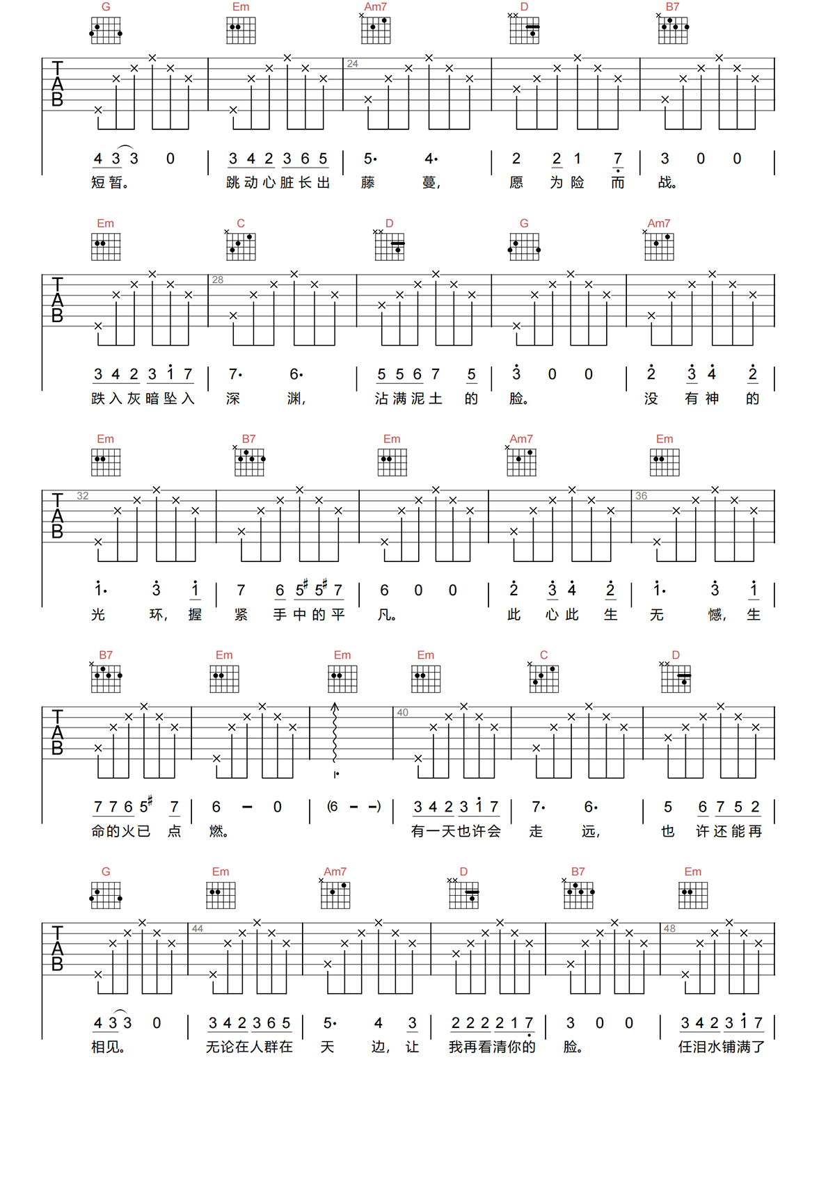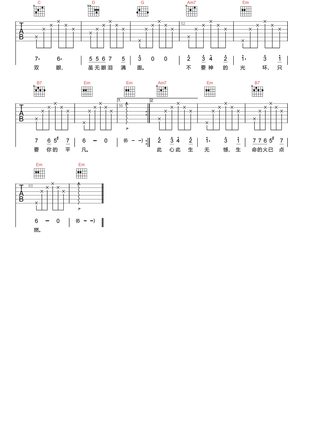 只要平凡吉他谱G调-张杰/张碧晨-简单原版六线谱-简单好上手