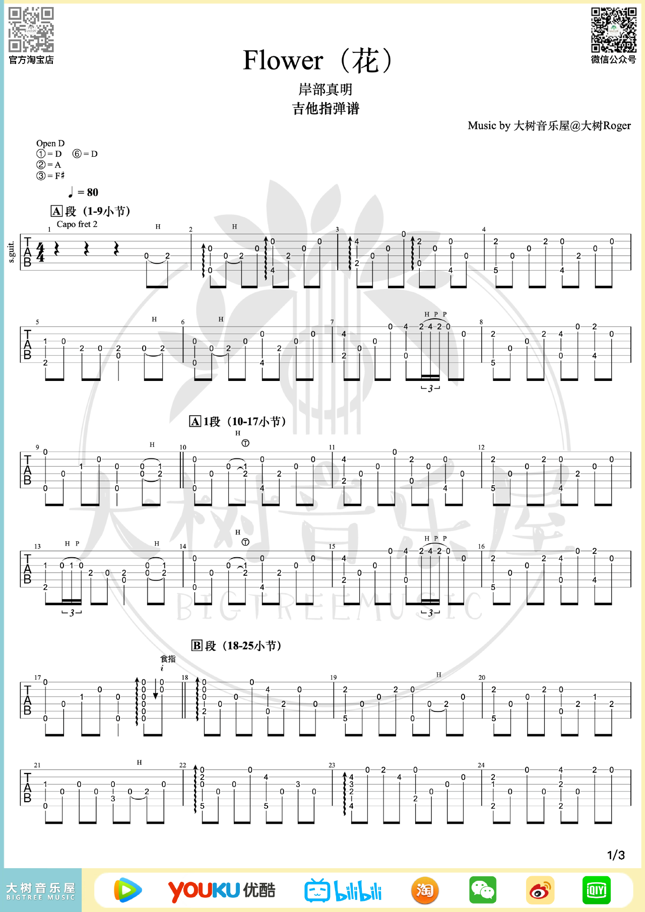 Flower指弹吉他谱-岸部真明-原版编配-独奏演示教学
