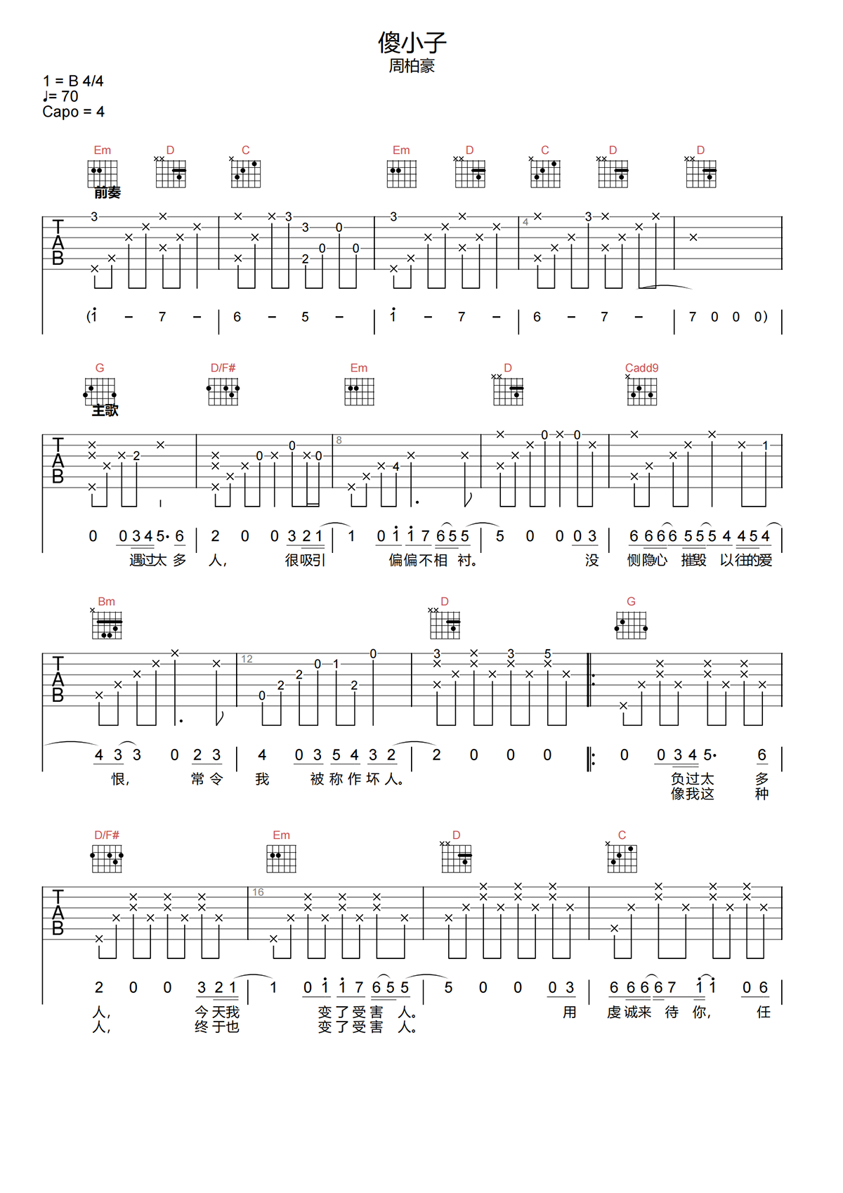 傻小子吉他谱-周柏豪《傻小子》G调图片谱-原版弹唱谱