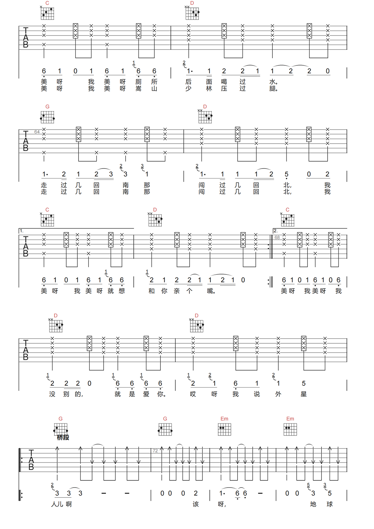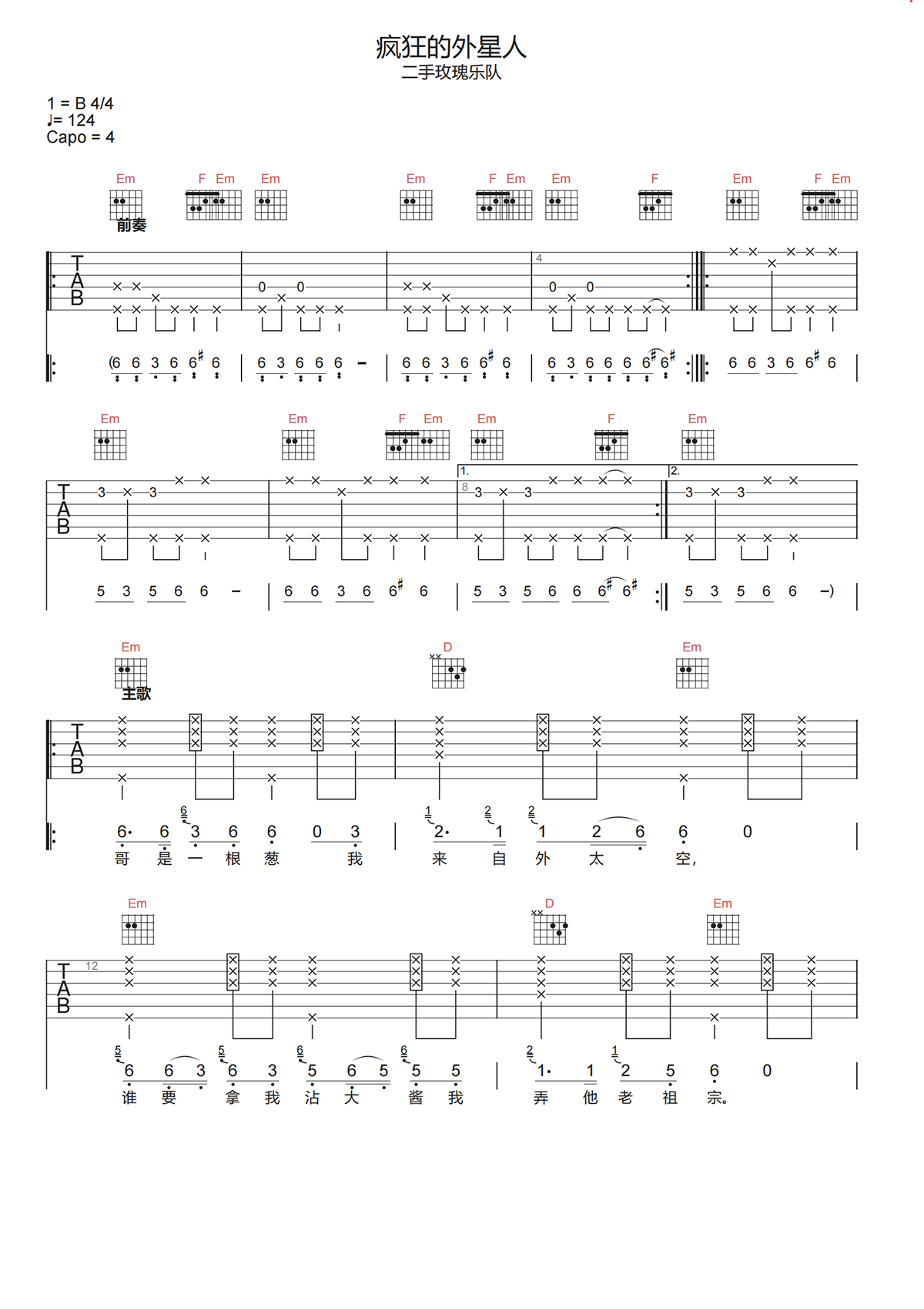 二手玫瑰《疯狂的外星人吉他谱》G调原版六线谱
