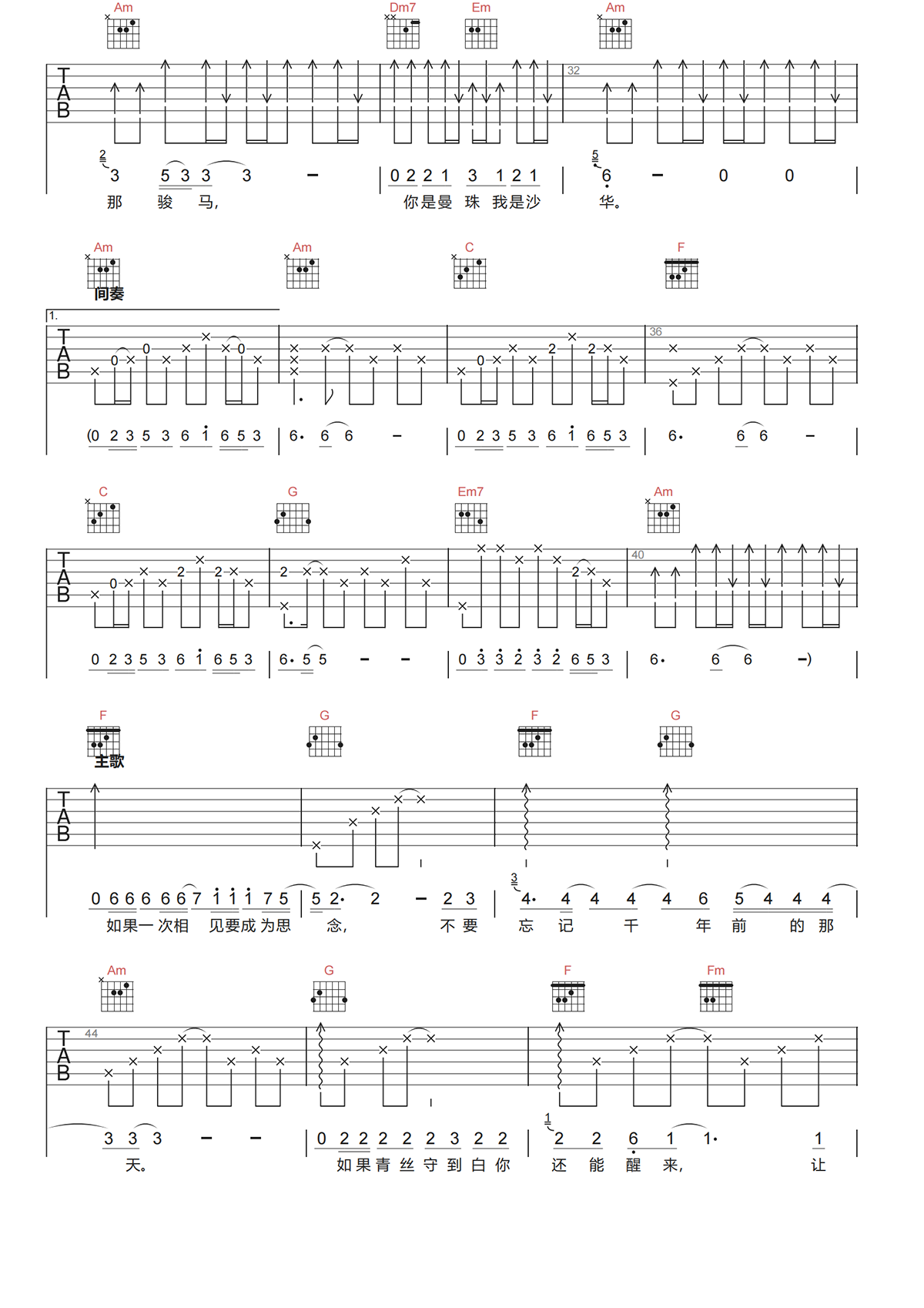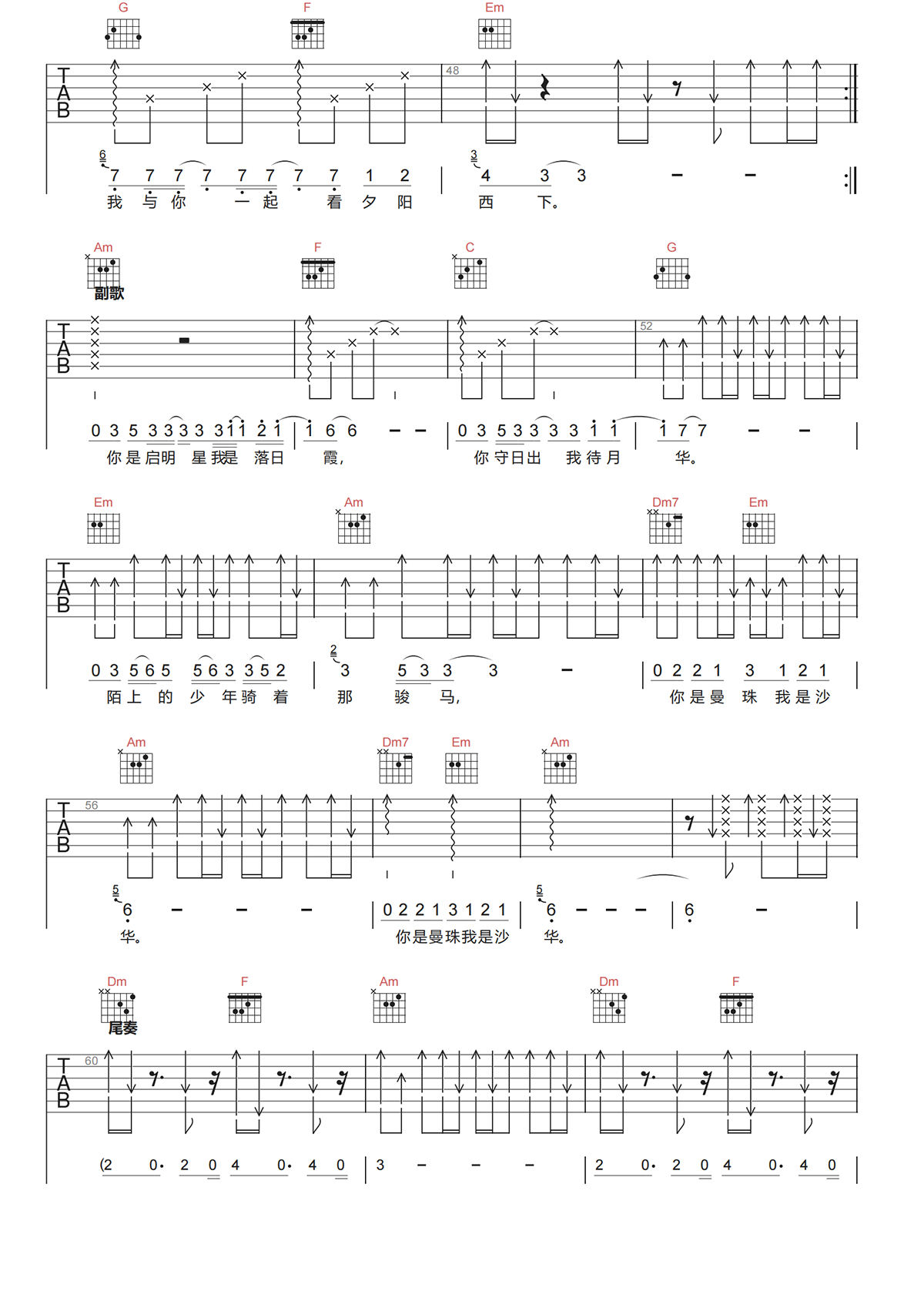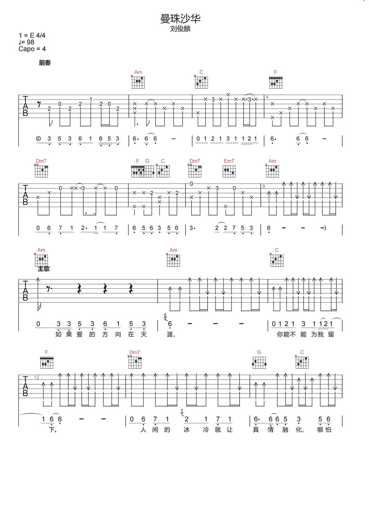刘俊麟《曼珠沙华吉他谱》C调原版弹唱谱