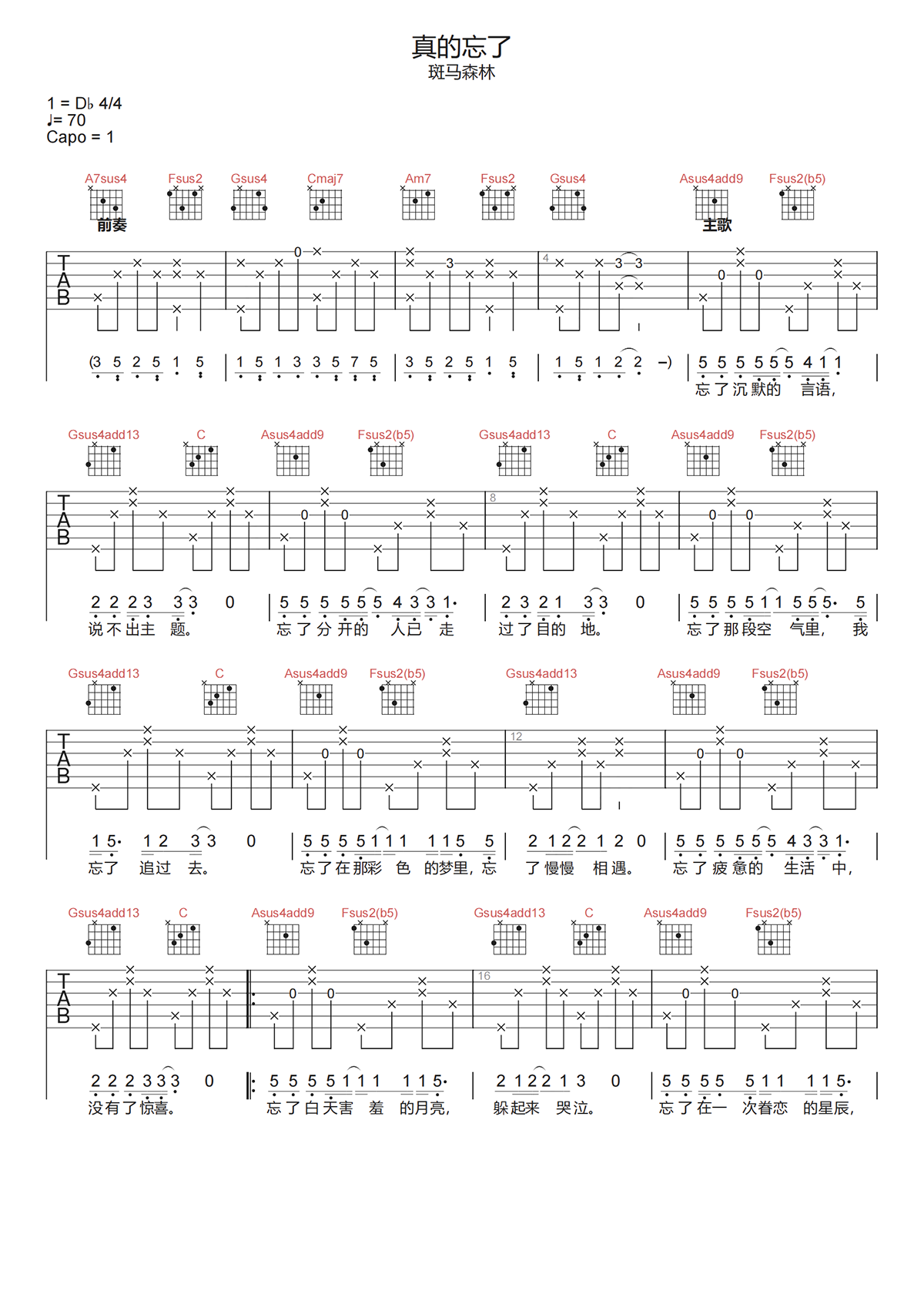 斑马森林《真的忘了吉他谱》C调原版弹唱谱