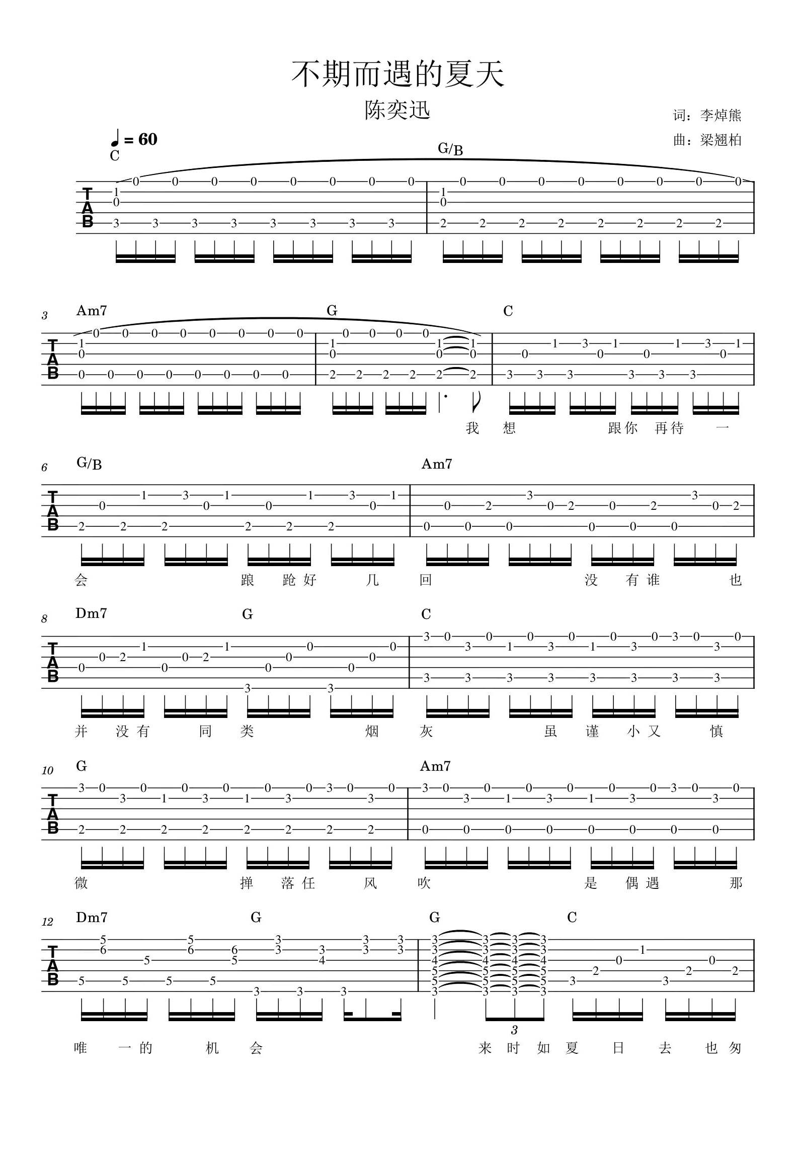 陈奕迅《不期而遇的夏天吉他谱》C调原版弹唱谱