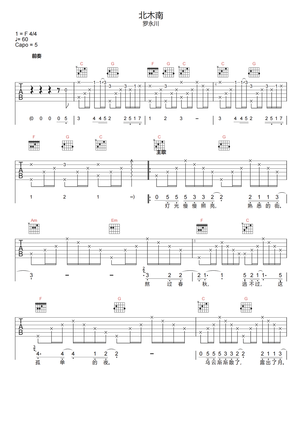北木南吉他谱C调-罗永川《北木南》弹唱六线谱-高清原版