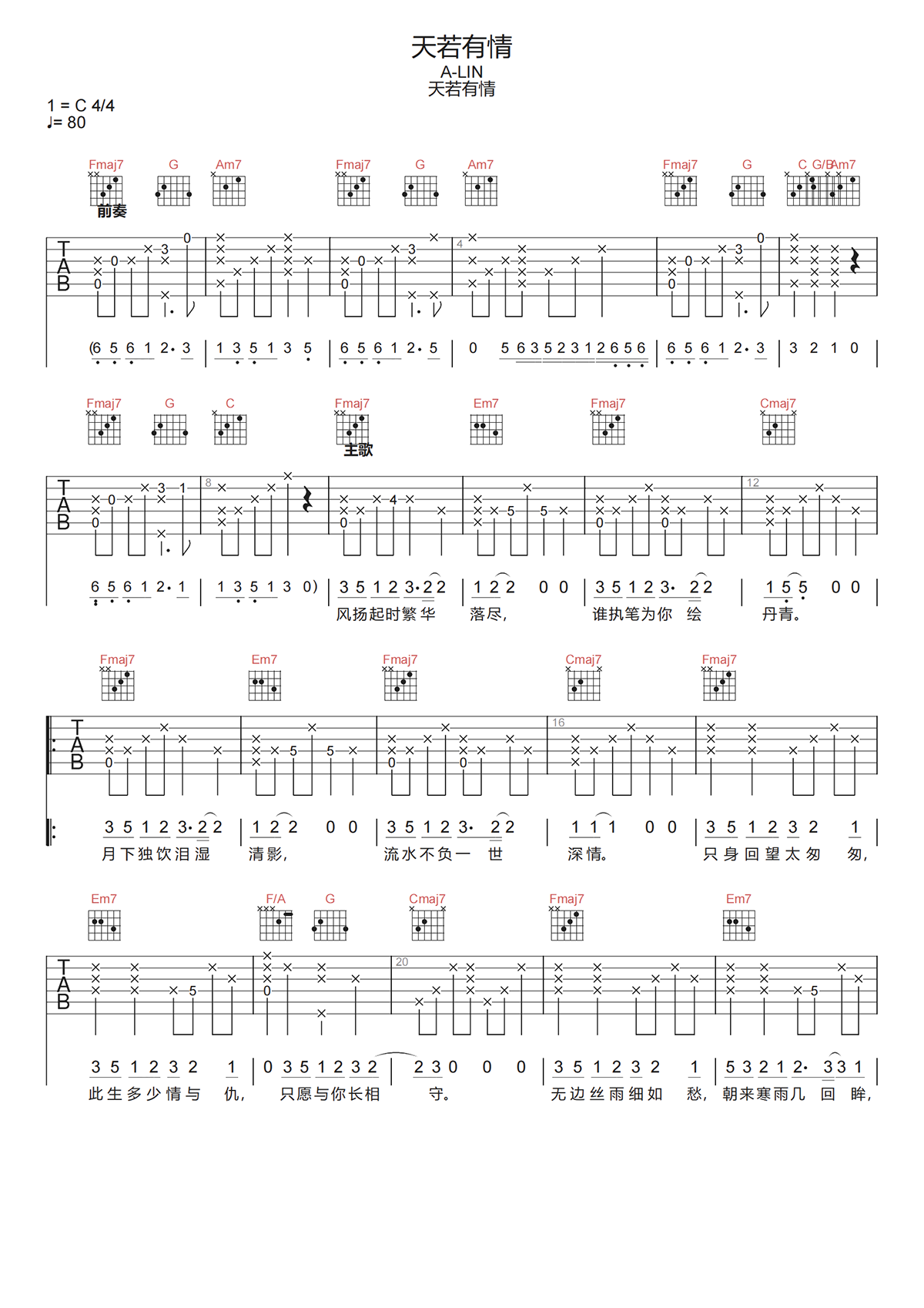 A-LIN《天若有情吉他谱》C调高清原版弹唱谱