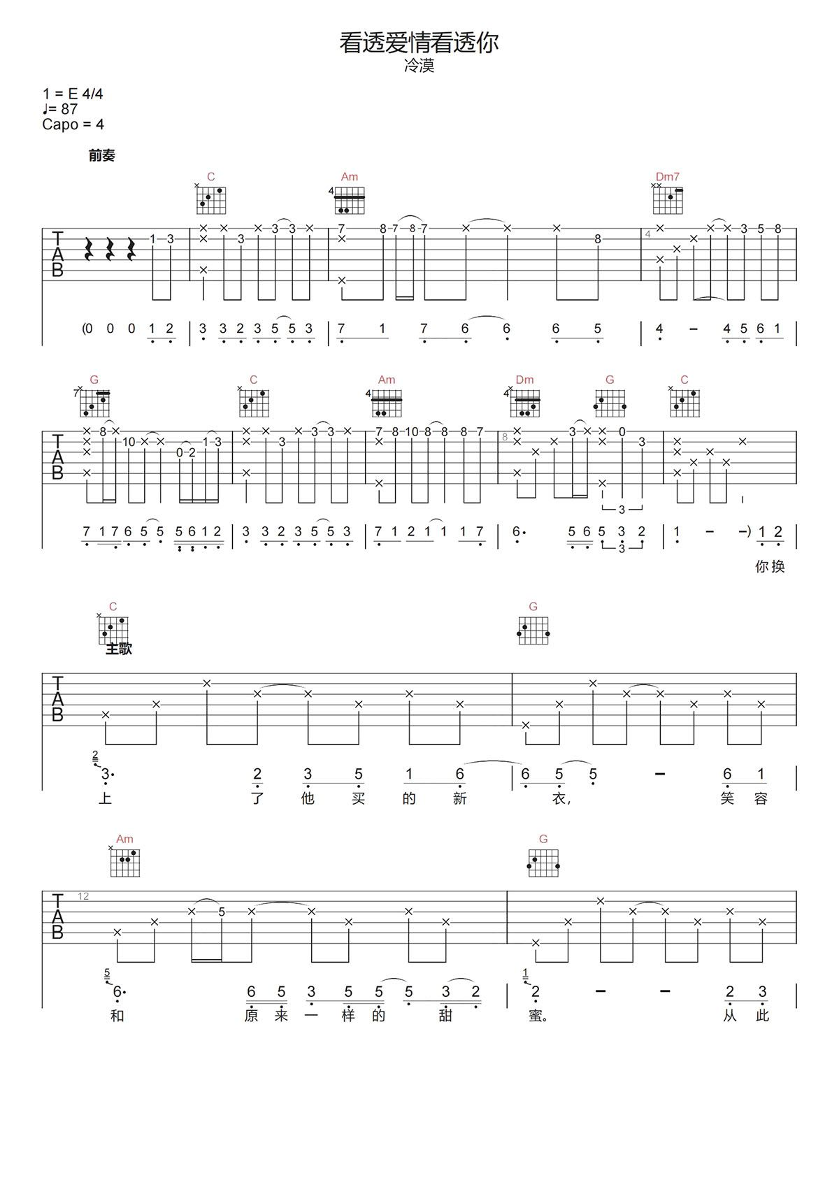 冷漠《看透爱情看透你吉他谱》C调原版弹唱谱