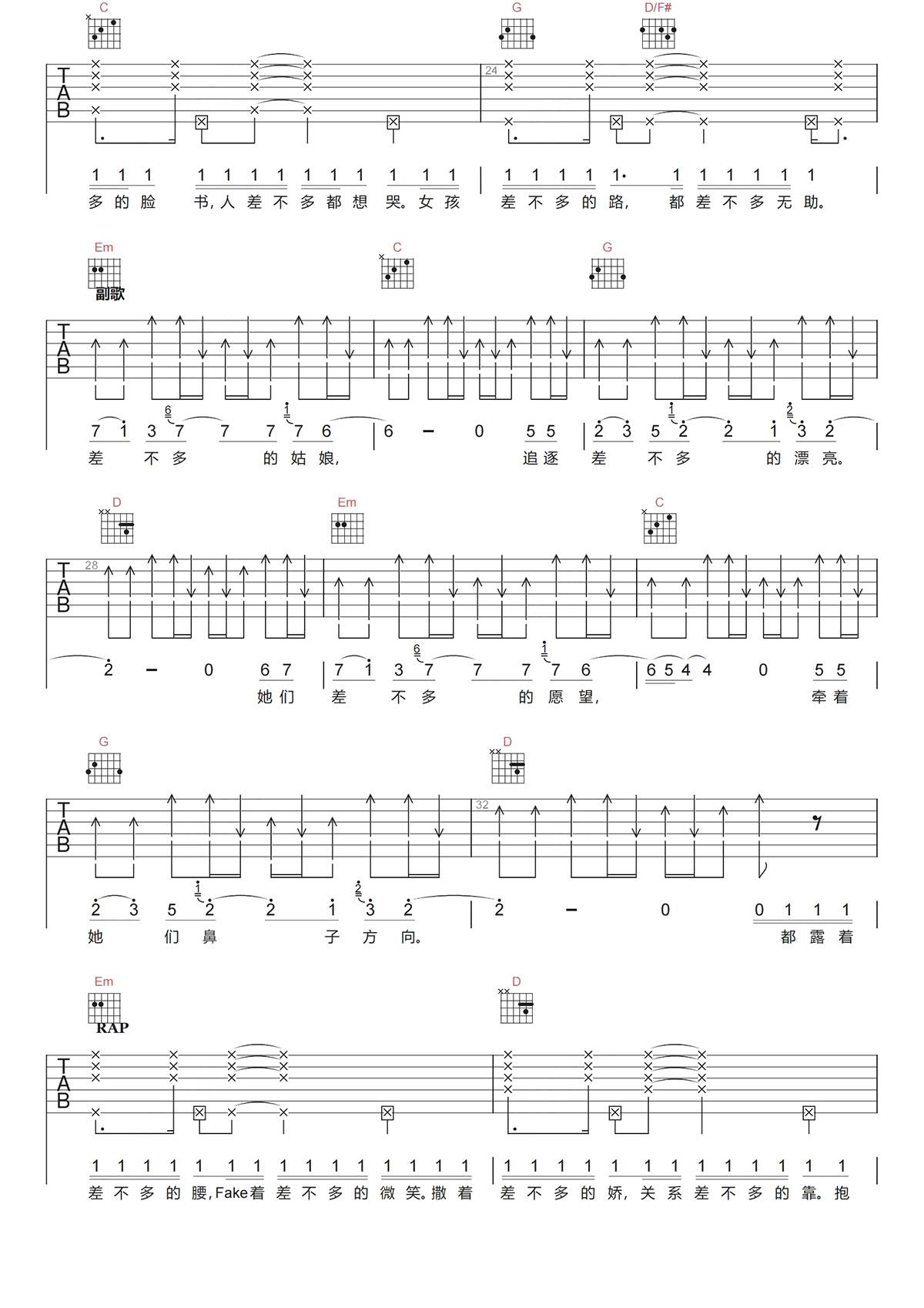 邓紫棋《差不多姑娘吉他谱》C调原版六线谱