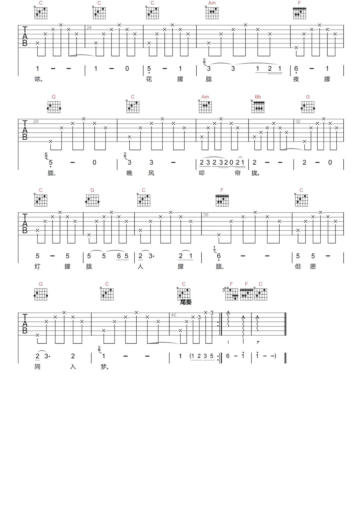 凤飞飞《月朦胧鸟朦胧吉他谱》C调高清原版图谱