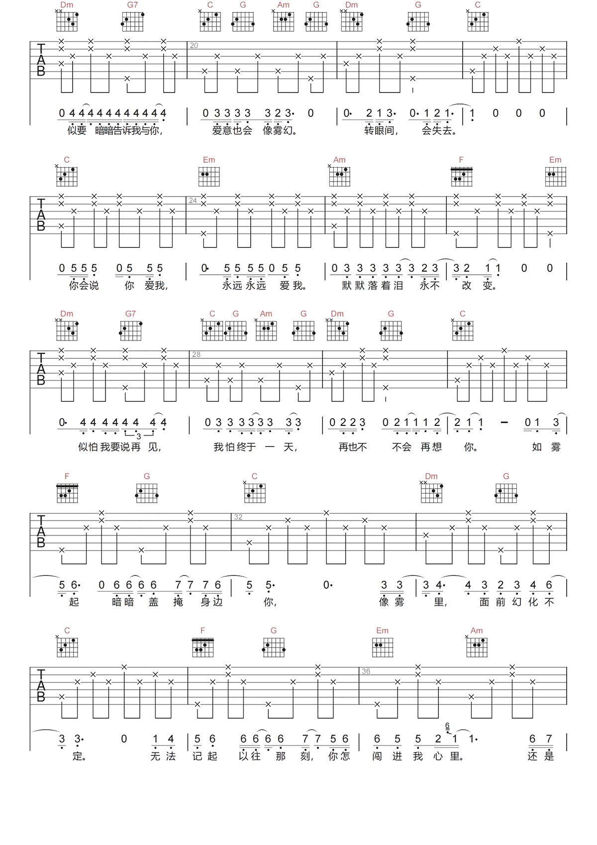 雾之恋吉他谱-谭咏麟《雾之恋》C调图片谱-原版弹唱谱