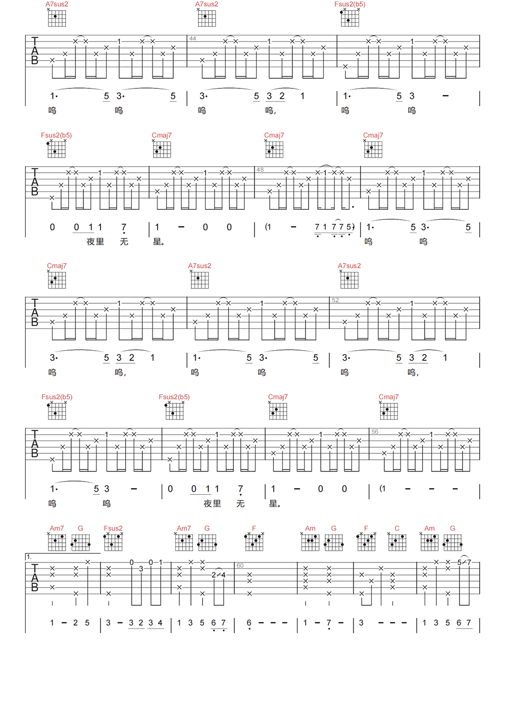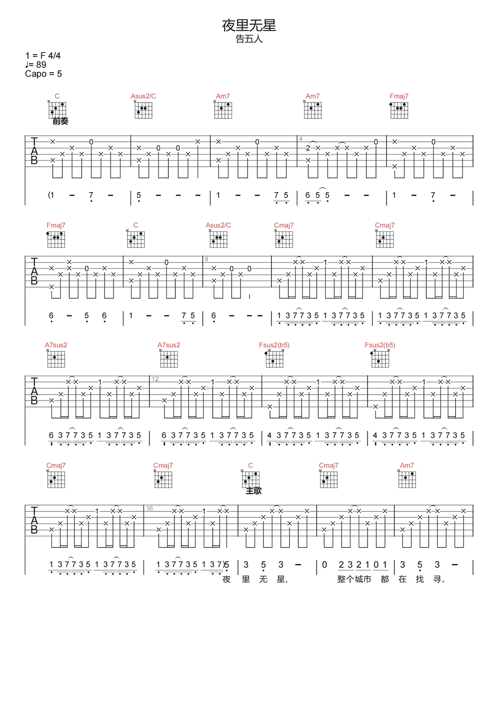 告五人《夜里无星吉他谱》C调高清原版六线谱
