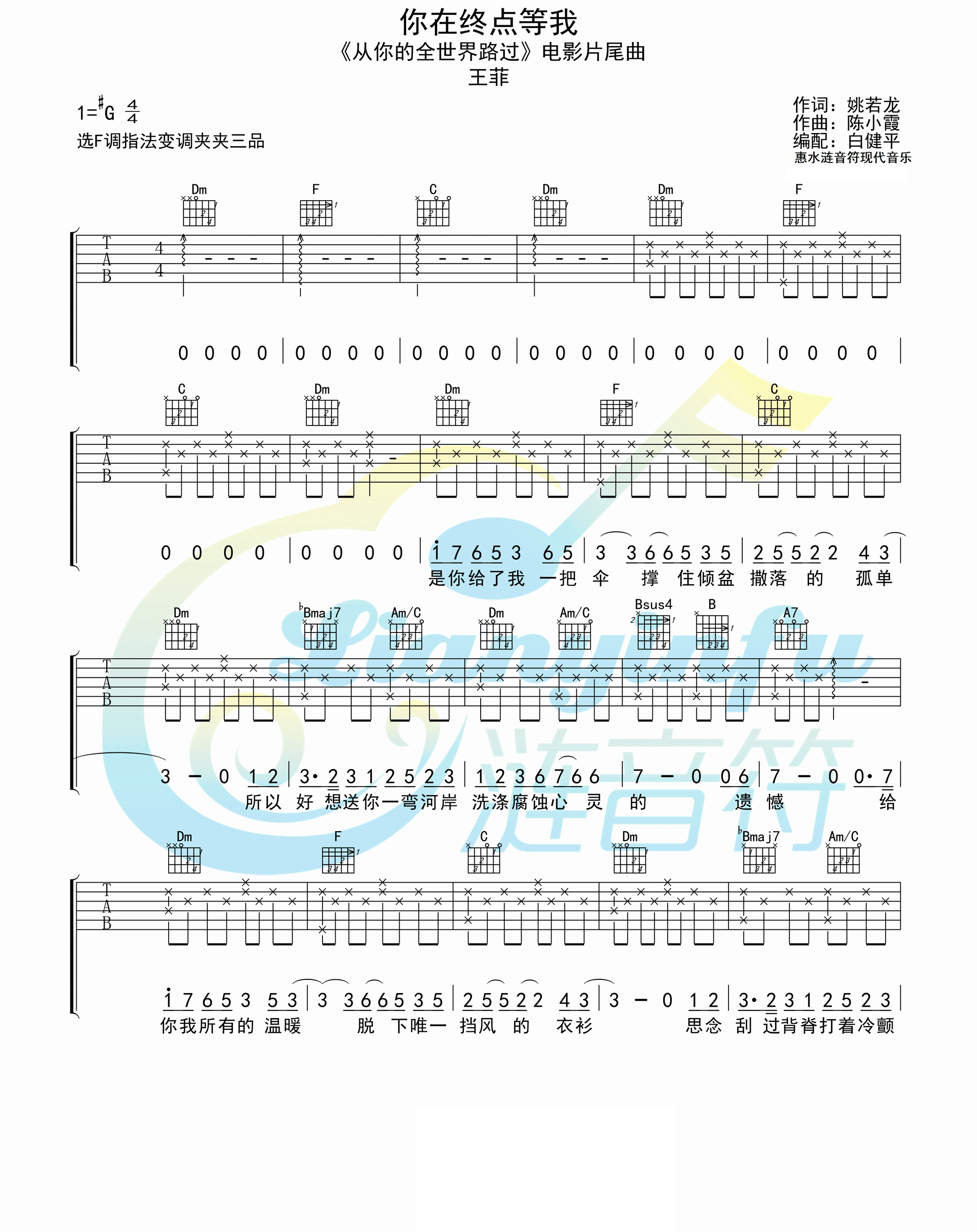 王菲《你在终点等我吉他谱》F调原版六线谱
