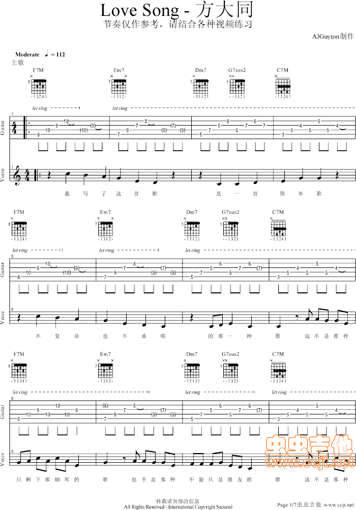 方大同《lovesong》简单F调弹唱教学,虫虫吉他版六线指弹吉他谱