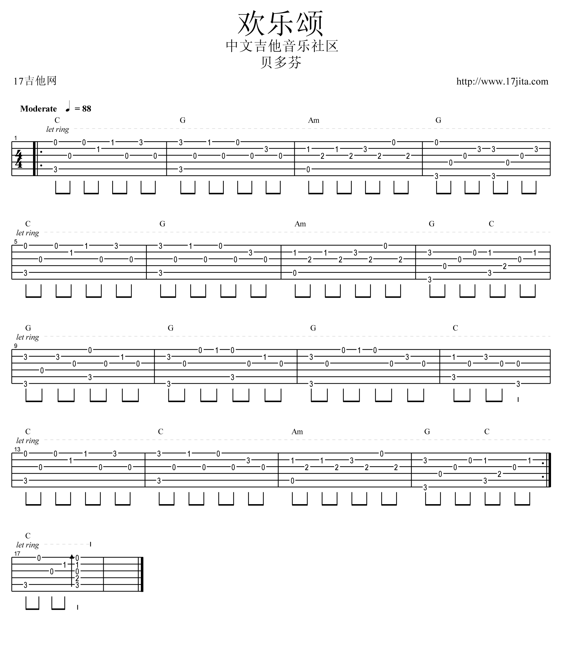 贝多芬《欢乐颂》简单吉他弹唱教学,17吉他版六线指弹吉他谱
