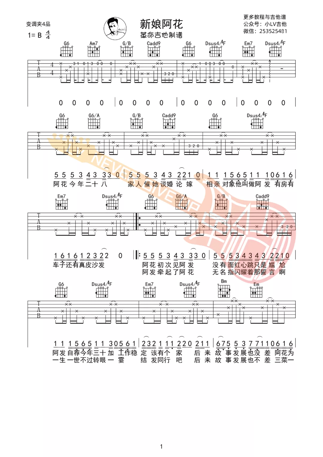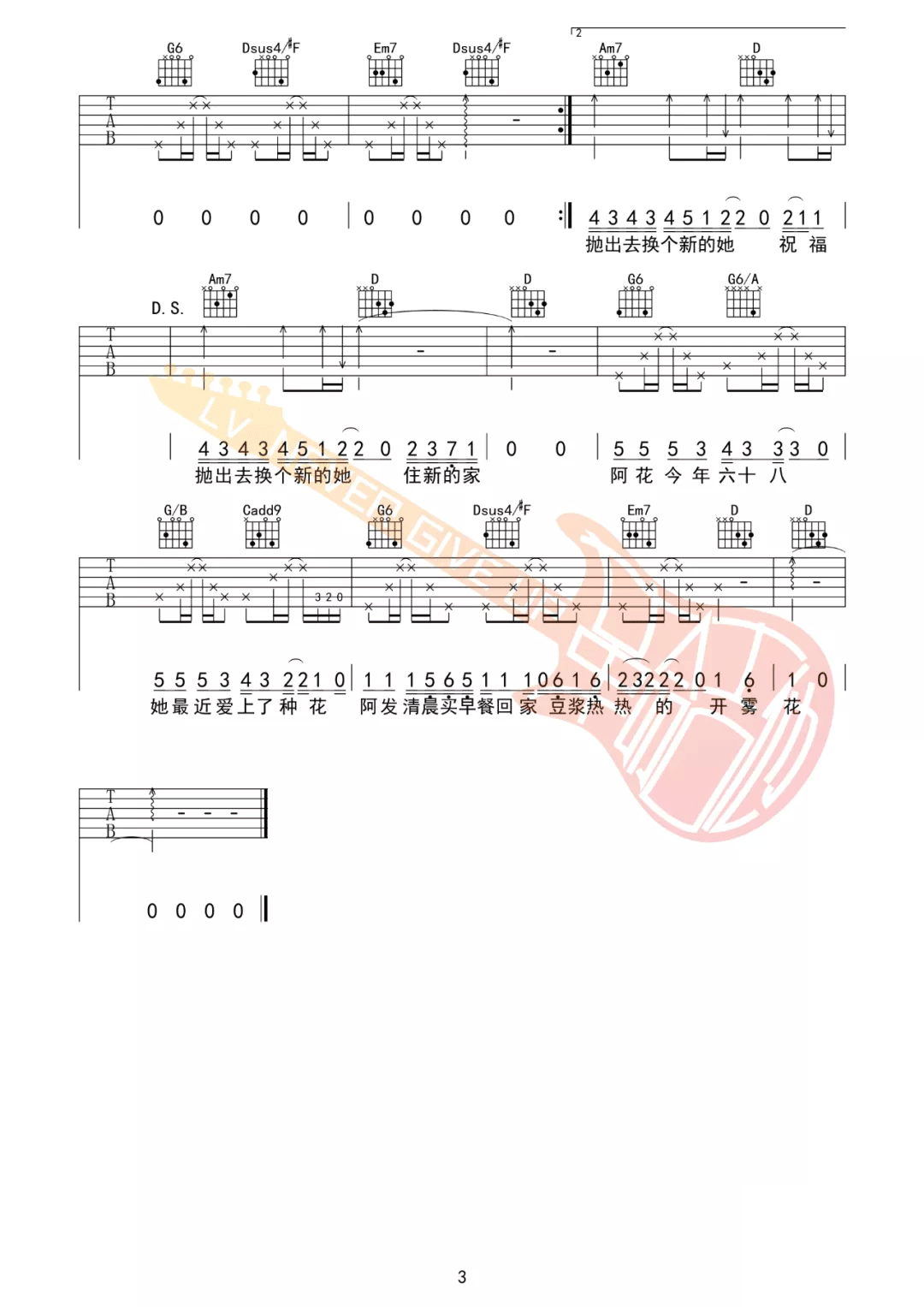 金玟岐《新娘阿花》简单G调指弹曲谱,高清六线吉他谱